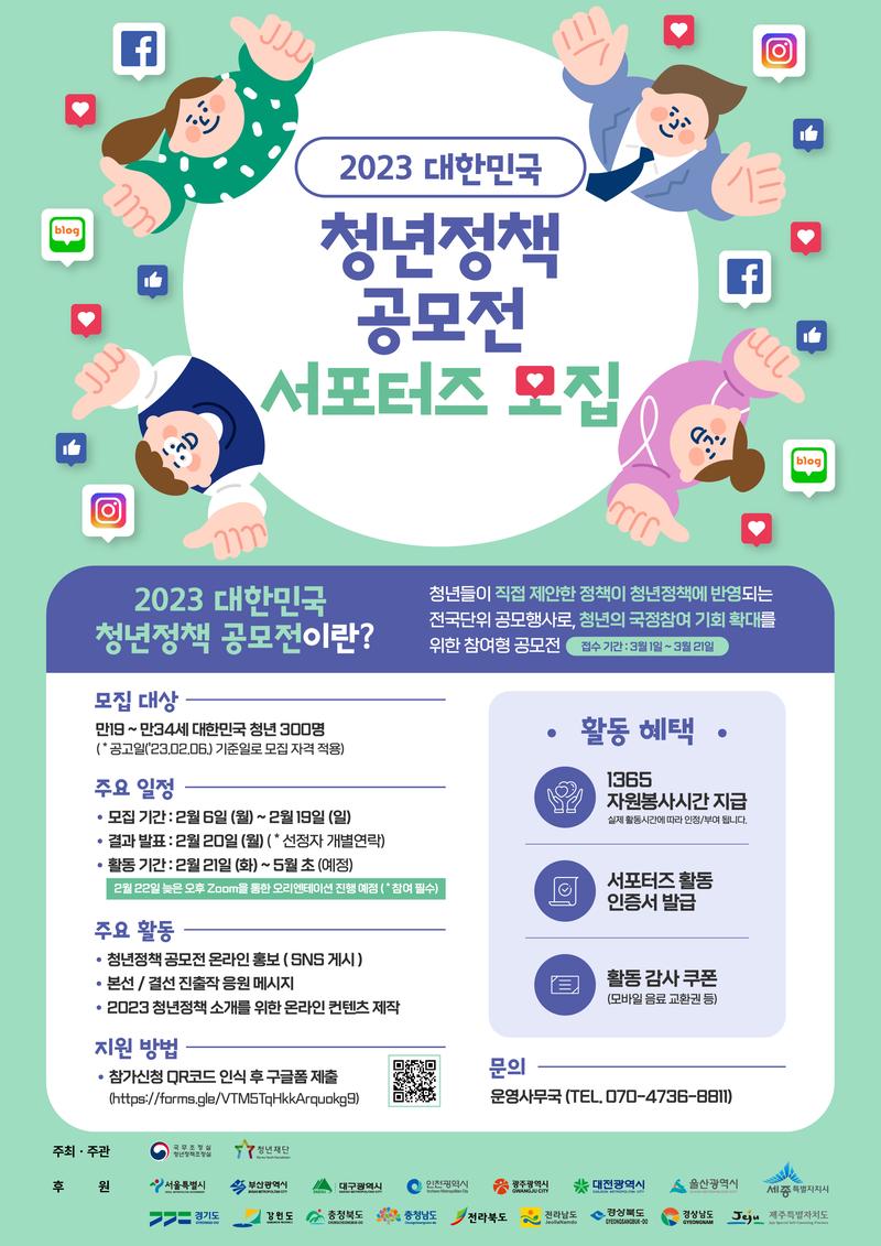 재단법인 청년재단과 국무조정실 청년정책조정실에서는 청년이 직접 제안한 정책이 청년정책에 반영되어 청년의 정책효능감을 높일 수 있는 「2023년 대한민국 청년정책 공모전」을 개최합니다. 이에 공모전의 성공적인 추진과 홍보를 위해 서포터즈(자원봉사자)를 모집하오니, 대한민국 청년분들의 많은 관심과 참여 바랍니다. * 모집대상 : 만 19세 \~ 만 34세 (공고일('23.02.06.) 기준) * 주요일정 - 모집기간 : ’23.02.06.(월) \~ ’23.02.19.(일) / 14일 간 - 결과발표 : ’23.02.20.(월), 선정자 개별연락 - 활동기간 : ’23.02.21.(화) \~ ’23.5월 초(예정) - 오리엔테이션 : ’23.02.22.(수), 온라인 ZOOM 설명회 / 선정자 참여필수 * 주요활동 - 대한민국 청년정책 공모전 온라인 홍보(SNS 게시, 소속학교 커뮤니티 홍보 등) - 공모전 심사단계별 홍보 및 응원 메시지 게재 - 심사진출작 온·오프라인 투표 참여 - 2023 청년정책 소개를 위한 온라인 콘텐츠 제작 및 홍보 - 기타 성공적인 공모전 추진을 위한 활동 등 * 지원내용 - 1365 자원봉사포털 봉사시간 지급(실제 활동시간에 따라 인정 및 부여) - 활동인증서 발급(활동기준 충족 시) - 활동 감사 쿠폰 제공(모바일 음료 교환권 등) * 신청방법 및 문의 - 온라인 설문응답 : https://forms.gle/8XDYKYYQ7CFp91hA7 - 운영사무국 TEL : 070-4736-8811 / e-mail. korea@2023youthpolicy.com