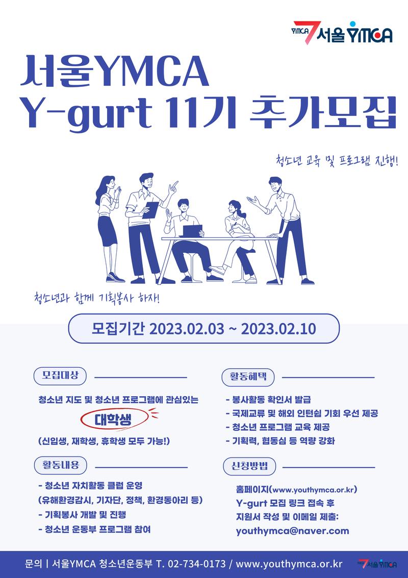 서울YMCA 청소년운동부 대학생 자원지도자 Y-GURT 11기 추가모집 ○ 모집개요 - 청소년운동부와 함께 청소년 프로그램을 이끌어 갈 대학생 자원지도자 선생님들을 모집합니다! 많은 지원 바랍니다.
