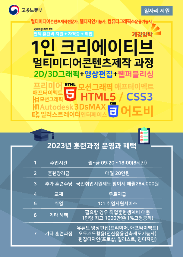 -4차 산업혁명 시대의 직업을 고민하는 취준생에게 추천 -전액 국비무료 교육, 교재 무료, 매월 훈련장려금(20만원) 지급 -3종목의 국가기술자격증 취득가능 (멀티미디어콘텐츠제작전문가, 웹디자인기능사, 컴퓨터그래픽스운용기능사) -포토샵, 일러스트레이션, 프리미어, 에프터이펙트(모션그래픽), 3D맥스(3D MAX), HTML5, css3 사용 -필요할 경우 1인당 천만원(1% 고정금리)까지 대출 가능(고용노동부) -1:1 취업지원서비스