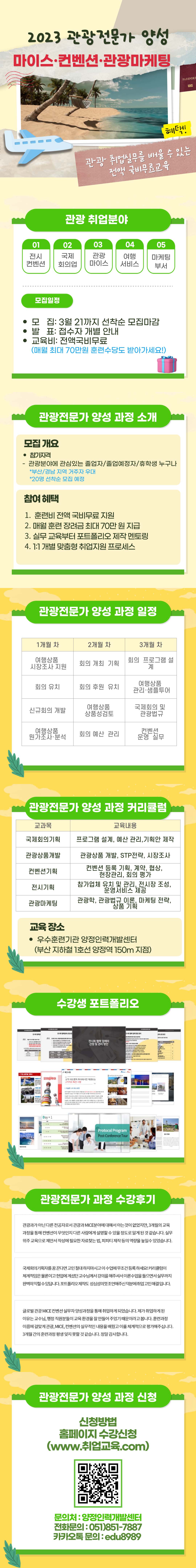 -관광분야 취업이나 창업에 관심이 있으신 분! -컨벤션, 호텔, 여행업에 대한 전문적인 강의를 듣고 싶으신 분! -마이스/컨벤션/관광마케팅 포트폴리오 제작과 멘토링을 받고 싶으신 분! -향후 관광산업 취업 및 창업을 위한 실무 지식이 얻고 싶으신 분! 그럼 양정인력개발센터에서 진행하는 <2023 관광전문가 양성 과정>을 당장 신청하세요! *무료 교육 신청 링크 https://www.jobyj.co.kr/ <2023 관광전문가 양성 과정 참가자 모집 안내> 양정인력개발센터에서는 관광분야 취업 및 창업 희망자를 대상으로 취업 실무 교육을 제공하기 위해 「글로벌 관광마케팅 컨벤션 전문가 양성」 교육을 실시할 예정입니다. 많은 관심과 참여 부탁드립니다. 자세한 내용은 포스터를 참고바랍니다. *취업 분야 - 전시컨벤션 / 국제회의업/ 마이스업/ 여행서비스/ 호텔숙박업