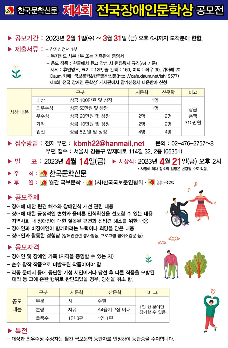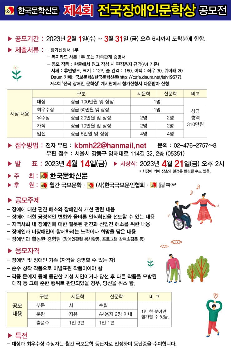 [지원 방법] 월간 국보문학/ 주간 한국문학신문 \| 제4회 장애인문학상 참가요강 및 참가신청서 - Daum 카페