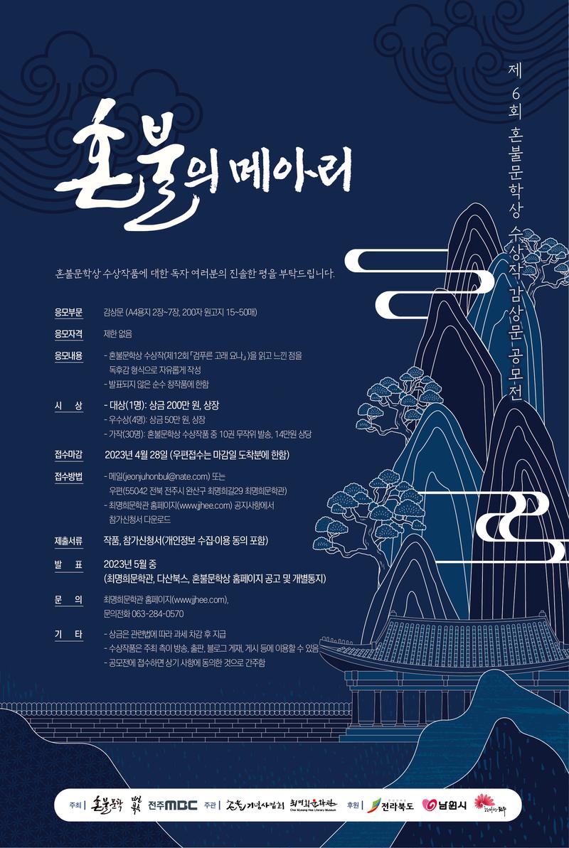 최명희문학관이 혼불문학상 수상작 감상문 공모전인 ‘혼불의 메아리’의 여섯 번째 참가자를 모집한다. 올해 대상 작품은 제12회 수상작인 김명주 작가의 「검푸른 고래 요나」. ‘고래인간’이라는 환상적인 소재로 환경과 기후에 강렬한 질문을 던지는 이 소설은 ‘다양한 대중문화의 상상력을 적극적으로 활용하고 이를 소설의 중요한 장치로 설정해 독자의 흥미를 자극하고 이야기의 퍼즐을 맞춰나가는 구성으로 가독성을 높였다.’라는 평을 얻었다. 참가를 원하는 독자는 작품을 읽고 느낀 점을 A4용지 2장∼7장(200자 원고지 15매∼50매) 분량으로 자유롭게 쓴 뒤, 최명희문학관 홈페이지에서 신청서(개인정보동의서)를 내려받아 메일(jeonjuhonbul@nate.com)이나 우편(전북 전주시 완산구 최명희길29)으로 4월 28일(금)까지 제출하면 된다. 대상 1명에게 2백만 원, 우수상 4명에게 50만 원의 상금과 상장을 주며, 가작 30명에게 혼불문학상 수상작(10권)을 선물한다. 지난 대회보다 우수상 숫자를 2배 늘렸다. 수상작 발표는 5월 말. 대상과 우수상 수상자는 혼불문학상 시상식에서 시상한다. 최명희문학관과 전주MBC, ㈔혼불문학, 다산북스가 마련한 이 공모전은 좋은 독자가 좋은 작가와 작품을 만든다는 믿음에서 시작돼 인문학적 감성을 지닌 독자를 발굴하고 그 독자들의 꾸준한 독서 활동을 바라는 마음으로 지금껏 이어지고 있다. 지난 다섯 번의 공모전에서 10대부터 80대까지 다양한 연령층이 국내·외에서 골고루 참가했고, 2,033편의 작품이 접수되는 등 ‘혼불의 메아리’가 대한민국을 대표하는 독후감 대회로 성장하고 있음이 확인됐다. 문의 063-284-0570.