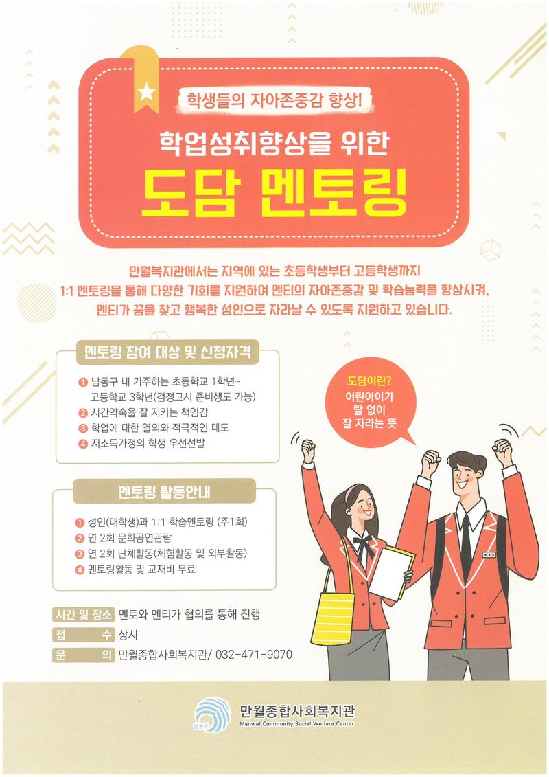 ※ 주 1회 대면활동을 원칙으로 진행됩니다. 간담회, 멘토교육, 정서활동, 단체활동 등 세부프로그램에 참여 가능하신 분을 모집하고 있습니다. ※ 문의 : 윤다영 사회복지사(032-471-9070)