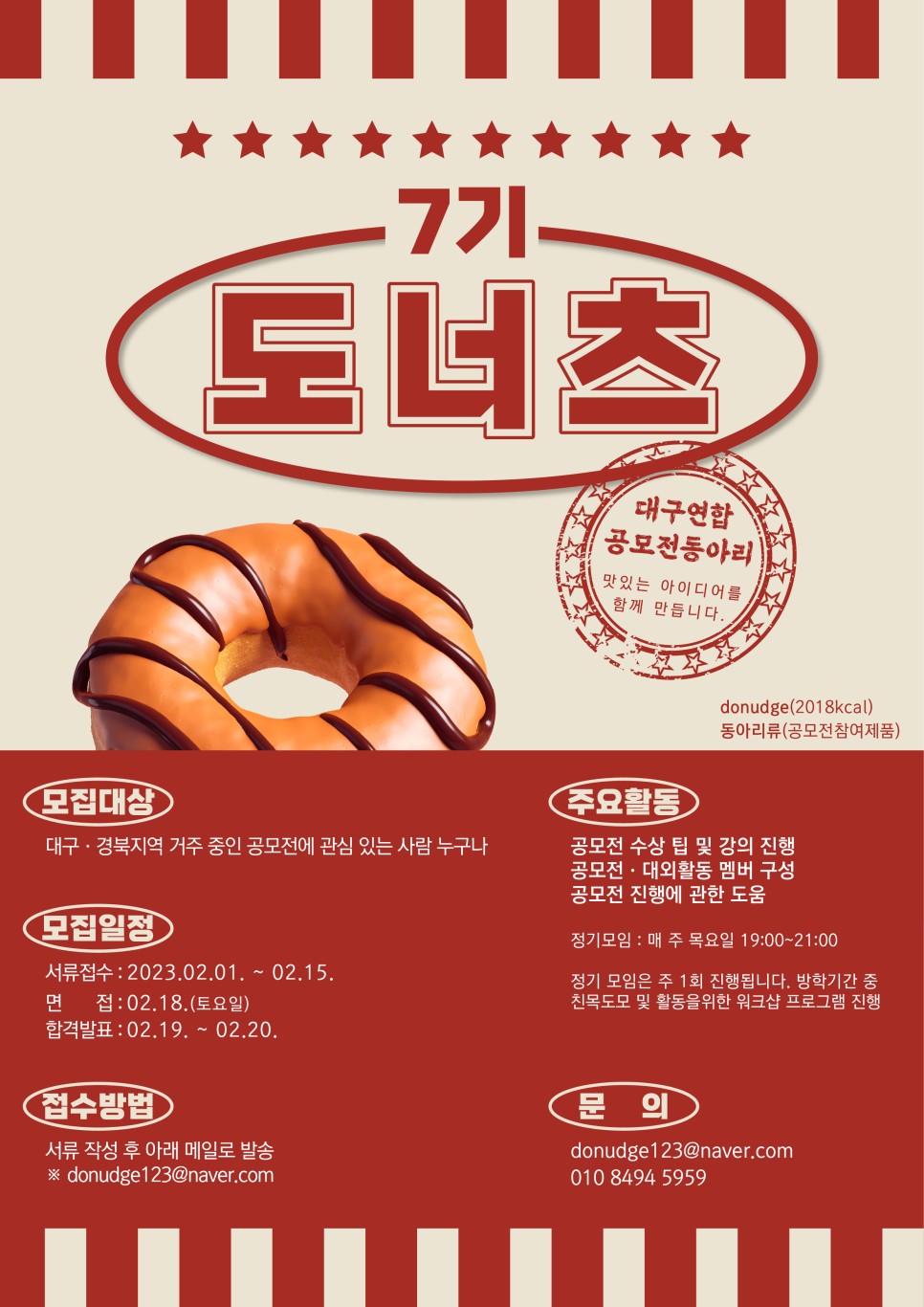 안녕하세요. 대구 연합 공모전 동아리인 도너츠입니다. 이제 2022년이 지나고, 2023년이 시작된지도 벌써 한 달이 지났습니다. 도너츠도 1월 한달간 제주도도 갔다 오고 여러가지 일정들이 있었는데요. 이제 다시 열심히 달리기 위한 준비를 해보려 하는데요. 거기에 맞춰 7기 모집을 진행해보려고 합니다. 이번 7기 모집은 2월 1일부터 모집하여 15일까지 진행되니 늦지않게 접수해지면 됩니다! 항상 모집이 끝나고 연락 오시는 분들이 계시거든요... 이번에는 꼭 기한에 맞춰 접수해주세요 :) 도너츠 7기 모집에 관한 자세한 내용은 아래를 확인해주시면 됩니다. 확인하신 후 궁금하신 점이 있으시면 연락 주시면 되고, 접수는 아래 메일을 통해 보내주시면 됩니다. 감사합니다. - 대구 연합 대학생 공모전 동아리 도너츠7기 모집 안내