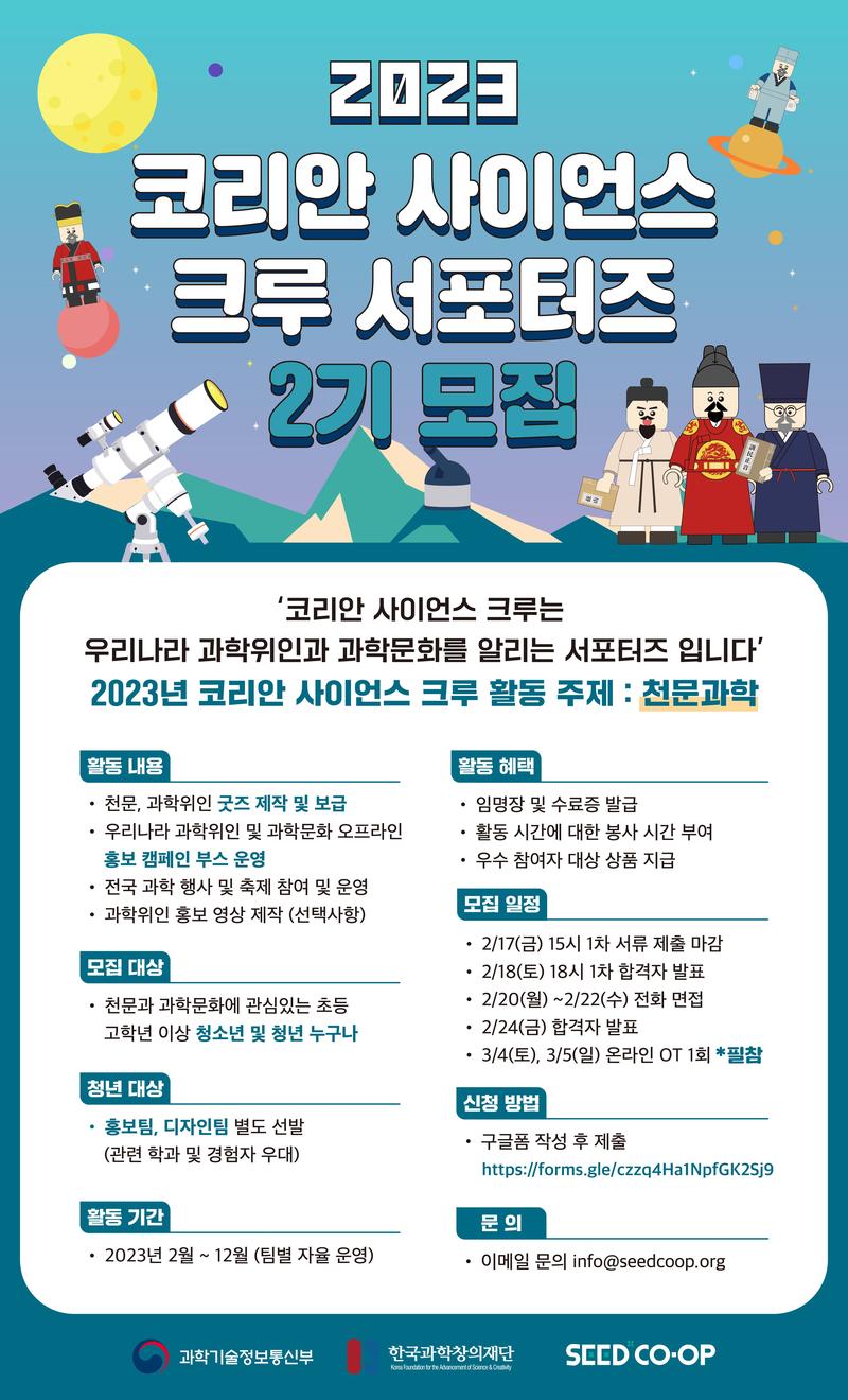 💙2023 코리안 사이언스 크루 서포터즈 2기 모집💙 🤔코리안 사이언스 크루 서포터즈가 무엇인가요? : 우리나라 과학위인과 과학문화를 알리는 청소년과 청년들의 모임입니다.
