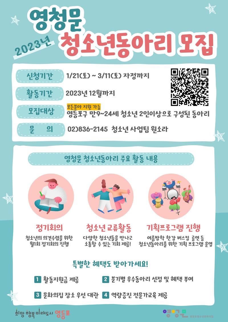 영청문 청소년동아리는 영등포구 청소년의 꿈과 끼를 위해 공간 및 활동비 등 적극 지원하는 활동입니다 :)