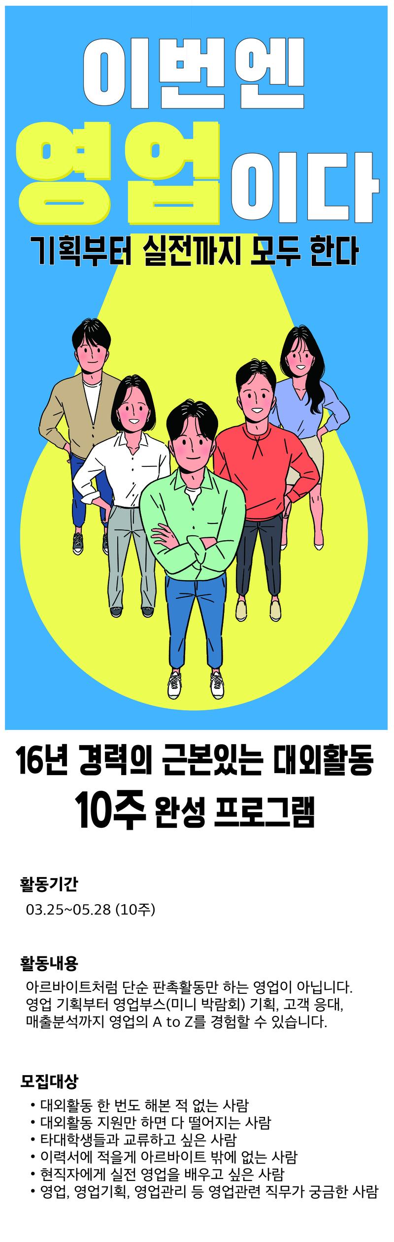 ▶ 모집 대상 🙆♀ 아래에 1가지라도 해당되면 지금 당장 지원하세요! ✔대외활동 한 번도 해본 적 없는 사람 ✔대외활동 지원만 하면 다 떨어지는 사람 ✔타대학생들과 교류하고 싶은 사람 ✔이력서에 적을게 아르바이트 밖에 없는 사람 ✔현직자에게 실전 영업을 배우고 싶은 사람 ✔영업, 영업기획, 영업관리 등 영업관련 직무가 궁금한 사람 ✔대학생, 졸업생, 취준생 모두 가능!