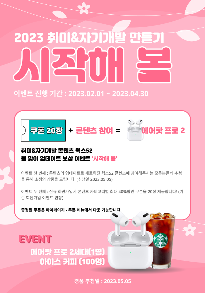 🌸 Weeks52 봄맞이 이벤트 🌸 “2023 새로운 봄을 맞아 취미와 자기개발 시작하자!” Weeks52의 다양한 콘텐츠에 참여하고 다양한 선물 받아가세요!