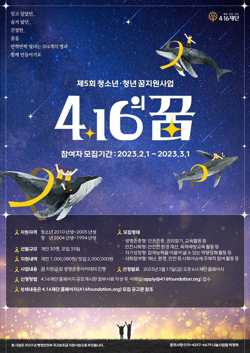 「4.16의 꿈」은 아이들이 마음껏 꿈꾸는 일상이 안전한 사회를 만들기 위해, 청소년과 청년들의 꿈 기금을 지원합니다. 마음껏 꿈꾸며, 간절한 꿈을 이루기 위한 여러분들의 다양한 도전을 지지하고 응원하오니 많은 참여 부탁드립니다.