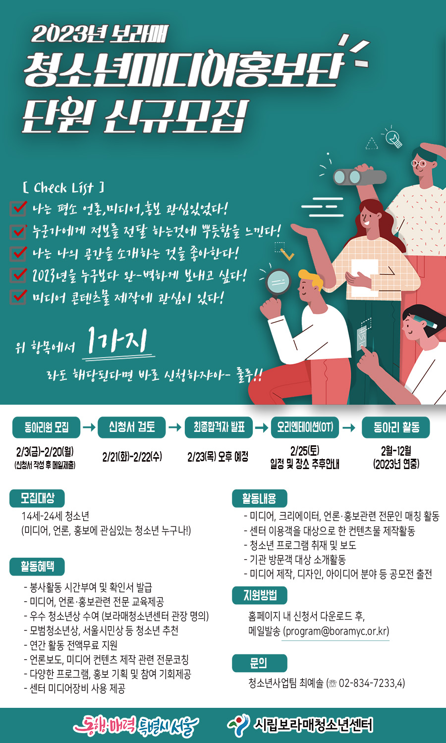 시립보라매청소년센터에서 ‘청소년미디어홍보단’ 활동을 통해 함께 성장 할 동아리원을 모집합니다! * 활동 내용 - 미디어, 크리에이터, 언론, 홍보관련 전문인 연계활동 - 센터 이용객을 대상으로 한 콘텐츠물 제작 - 웹디자인, 인디자인 관련 프로그램 교육 청소년 프로그램 취재 및 보도 기관 방문객 대상 소개활동 미디어제작, 디자인, 아이디어 분야 등 공모전 출전 * 활동 특전 - 봉사활동 시간 부여 및 확인서 발급 - 미디어, 언론, 홍보관련 전문 교육제공 - 우수 활동 청소년 표창장 수여 (모범청소년상, 서울시민상 등) - 연간활동 전액무료 지원 - 언론보도, 미디어 콘텐츠 제작 관련 전문코칭 - 다양한 프로그램, 홍보 기획 기회 제공 - 센터 미디어장비 사용 제공 *활동 기간 2023년 2월\~12월 *모집 기간 \~ 2023년 2월 20일(월) 까지 *모집 대상 - 미디어 홍보활동에 대한 열정이 있는 청소년 14세\~24세 - 열정 넘치고!! 적극적으로 활동할 수 있는 청소년 누구나!! * 신청방법 - 센터 홈페이지 내 [프로그램 안내 전체] 게시글 1039번 확인 후, 신청서 다운로드 및 작성 후 메일접수 (program@boramyc.or.kr) - 메일 제출 후, 확인 전화 필수 * 문의 시립보라매청소년센터 청소년사업팀 최예솔 (☎ 02-834-7233,4)