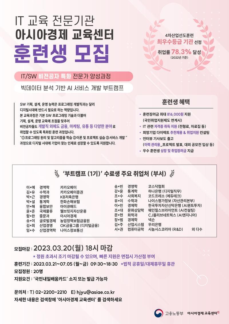 🔴 훈련생 혜택 ✔ 출석일수에 따라 월 최대 816,000원 훈련 장려금 지급 ✔ 희망 IT 관련 자격증 무제한 취득 지원 (전형료, 문제집 또는 기출문제) * 국가기술 빅데이터 분석기사, 정보처리산업기사, 국가공인 SQL 개발자, 데이터분석 준전문가(ADsP), 마이데이터관리사 등 ✔ 훈련생 인사이트 관리를 위한 인터뷰 기사보도 출고 (대·내외 공모전 입상 시) : 아시아경제 교육센터는 언론기관 인프라를 활용해 입상 시 온라인 기사에 홍보됩니다. 자기소개서 up! ✔ 우수 훈련생 상장 수여 및 장학금(취업지원비) 지원 ✔ 희망기업 추천채용, HR 전문가 1:1 컨설팅 진행 : ‘신한금융지주 FUTURE'S LAB’, ‘우리금융지주 디노랩’ 육성기업을 대상으로 하는 아시아경제 협약기업 30여 개사를 포함해 희망기업에 다이렉트 추천채용 진행 ✔ 채용 연계형 프로젝트 발표회(Demo-day) : IT 기업 임직원 심사위원 참여 및 기술 평가, 훈련생 면접 기회 제공. 🔴 지원하는 법 아시아경제 교육센터 홈페이지에서 참가지원서 제출 수업에 참여하시고 싶은 분, 상담하고 싶은 신 분 모두 신청해주세요. 순차적으로 연락드리겠습니다.