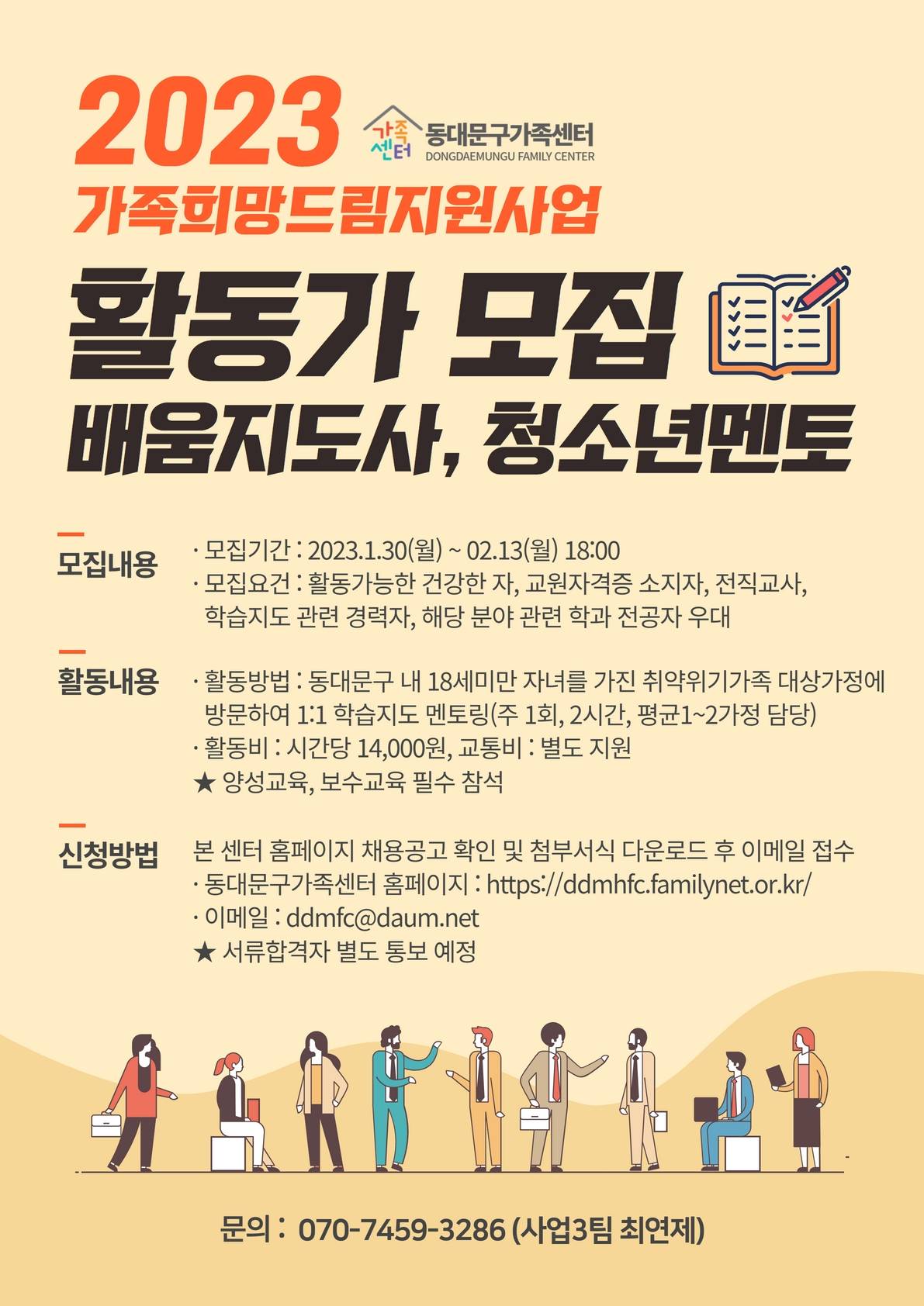 2023년 가족희망드림지원사업 2기 활동가(배움지도사, 청소년부모멘토) 모집