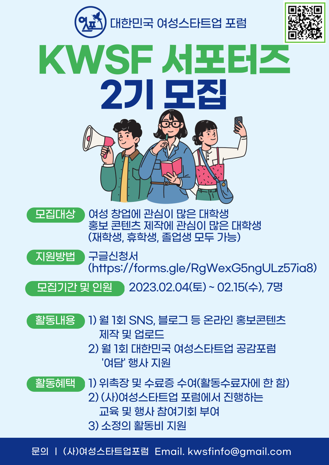 [KWSF 서포터즈 모집안내] - 모집대상 : 여성창업과 홍보콘텐츠 제작에 관심이 많은 재학생\, 휴학생\, 졸업생 등 - 모집인원 : 7명 - 모집기간 : 2023년 02월 04일 (토)\~ 2023년 02월 15일 (수) - 지원방법 : 구글신청서(https://forms.gle/JiH1MbVYMcLSCN6G9)를를) 통한 서포터즈 지원서 접수 - 면접일정: 2023년 02월 20일(월) / 개별공지 -> ZOOM - 선발통지 : 2023년 02월 21일 (화) / 개별통지 [발대식 및 오리엔테이션] - 목적 : 대한민국 여성스타트업 포럼 소개\, 서포터즈 운영방향 안내\, 서포터즈 위촉장 수여 - 일시 : 2023. 02.24 (금) 예정 - 장소 : 스페이스 시드앤 (서울 서초구 반포대로 23길 45-4)