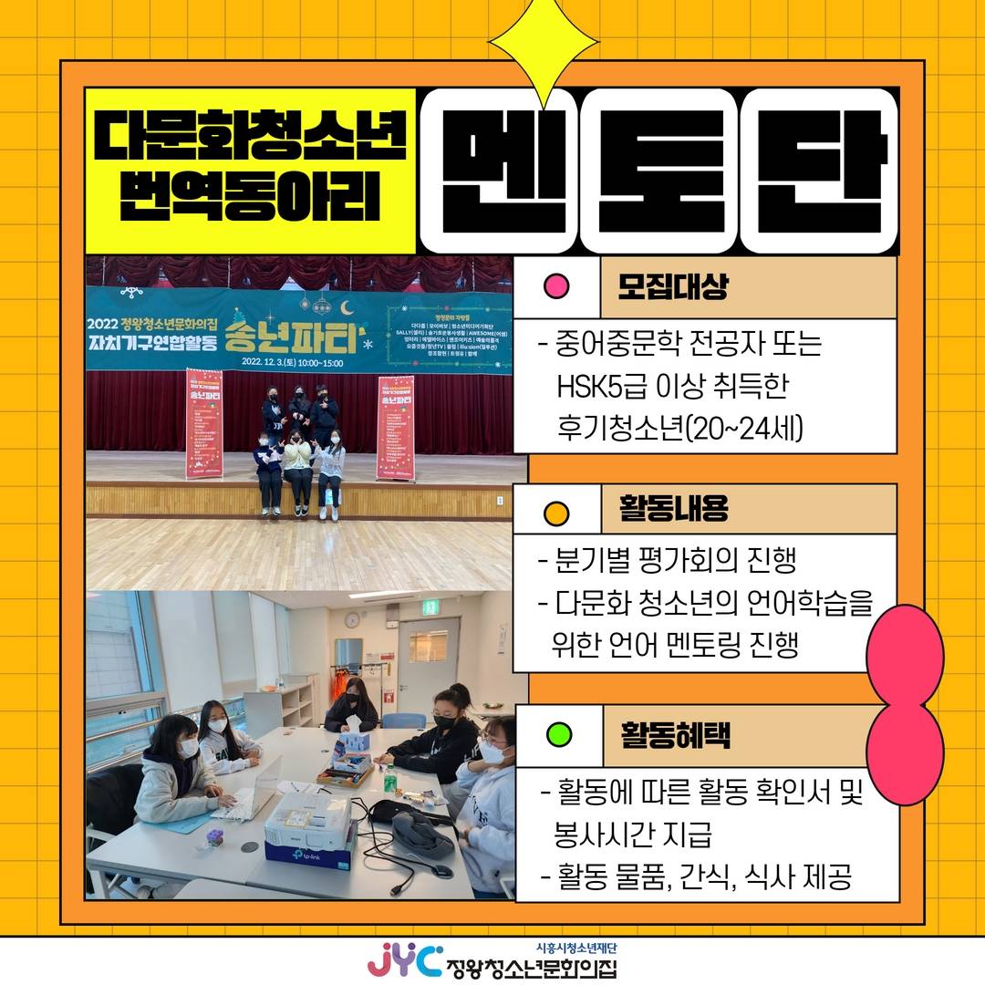 📌 정왕청소년문화의집의 다양한 홍보물 및 컨텐츠 번역활동을 진행할 다문화 청소년 번역동아리 ‘다다름’을 멘토링 해줄 후기청소년 멘토를 모집하고 있습니다!