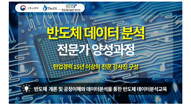 [반도체 데이터 분석 전문가 양성과정] ● 접수 기간 : \~ 03. 17(금) ● 연수 기간 : 23년 03월 중순 (세부일정 확정 후 재공지 예정) ● 활동 내용 -반도체 개론 -반도체 소자 -파이썬 프로그래밍 -데이터분석과 시각화 -R기반 데이터 분석 -반도체 데이터 시각화 실습 ● 모집 대상 -반도체 기업 취업을 희망하는 청년 구직자