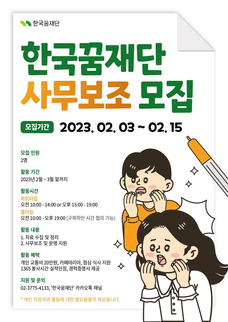 한국꿈재단은 꿈꾸는 모든 사람에게 꿈을 이루기 위한 기회를 보장하기 위해서 ‘꿈 멘토링’, ‘교육 콘텐츠’, ‘체험활동’ 사업을 진행하는 재단법인입니다. 한국꿈재단의 사업 중 ‘꿈 멘토링’인 ‘런치위드히어로’ 사업은 꿈꾸는 청소년이 가정 상황이나 부모의 지위와 무관하게 자신의 꿈의 영웅을 만나 점심 식사를 함께하며 따뜻한 격려와 실질적 조언을 받는 기회를 제공하는 공익 프로그램입니다. 본인의 능력을 맘껏 펼칠 수 있는 한국꿈재단에서 꿈꾸는 청소년과 꿈의 영웅의 만남을 이루어주실 ‘런치위드히어로’ 자원봉사자분을 모집하오니 많은 관심과 지원 부탁드립니다^_^ ‧모집 기간 : 2023. 02. 03\~2023. 02. 15