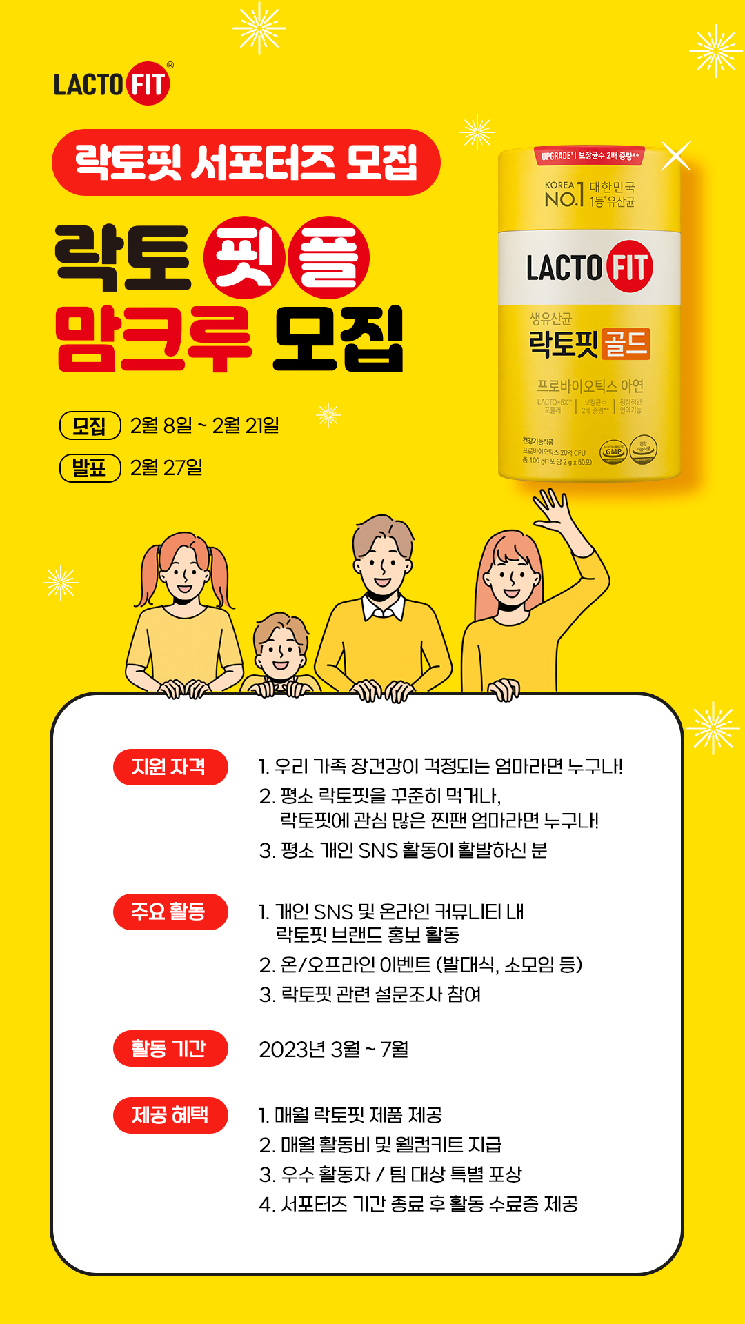 대한민국 1등 유산균 락토핏과 다양한 경험을 함께할 락토핏플 2기에 많은 지원 바랍니다.