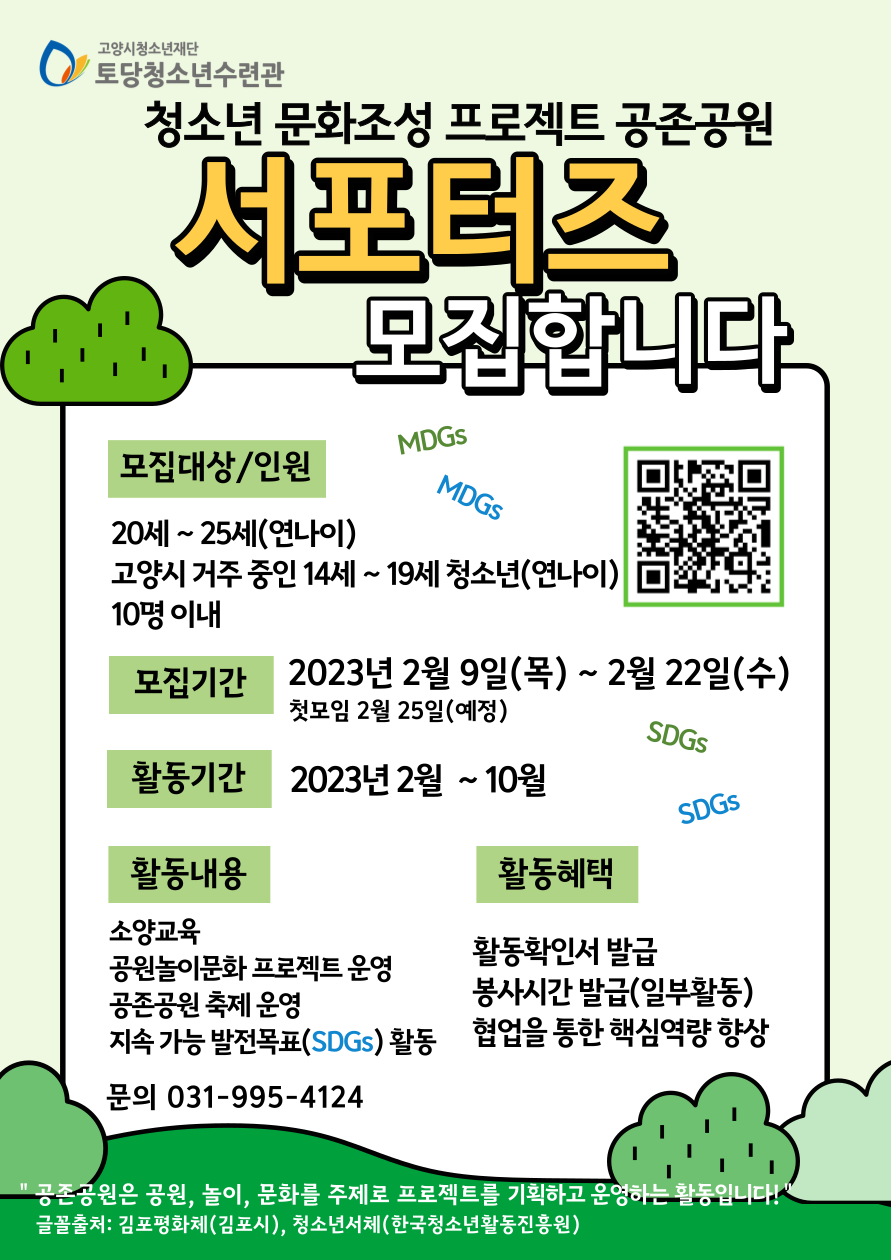 2023년에는 공원, 놀이, 문화를 주제로 다양한 놀이문화 프로젝트를 기획하여 운영해 나가려고 합니다! 공존공원 서포터즈 여러분이 직접 고양시의 공원을 살펴보고 청소년과 지역의 요구를 파악하여 프로젝트와 축제를 기획하고 운영하게 되는 것이지요! (서포터즈가 기획한 놀이문화 프로젝트에 11세\~13세 청소년 15명이 참여하게 됩니다) 연간 활동을 통해 직접 프로젝트를 기획하고 운영하고 싶은 청소년 협업의 과정을 통해 청소년 핵심역량을 향상하고 싶은 청소년 지역사회 청소년들과 어울리고 지역사회와 소통하고 싶은 청소년 어서어서 신청해주세요!