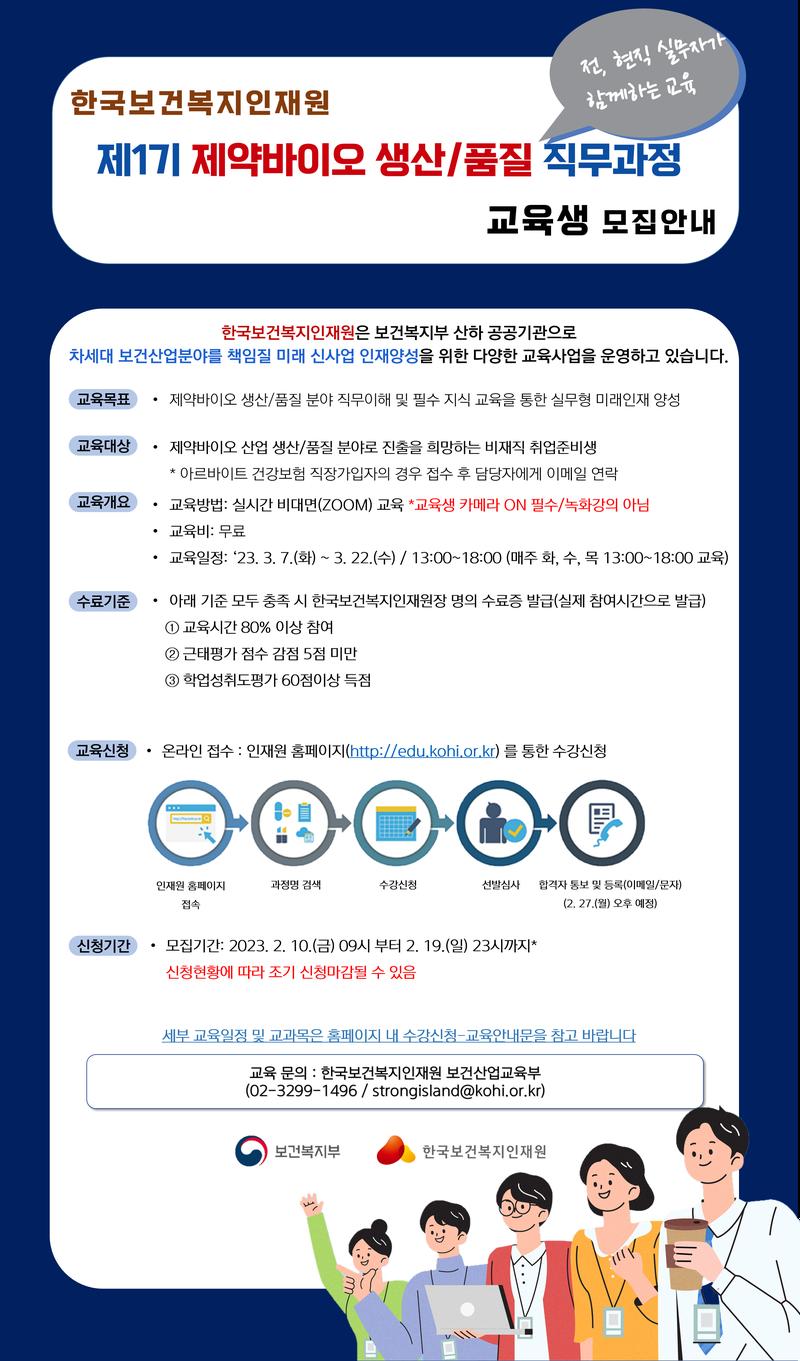 이 중, 제약산업의 생산, 품질(QA, QC 등) 직무 인재양성을 위한 제1기 제약바이오 생산, 품질 직무교육과정을 개설하였으니, 관심있는 분들의 많은 참여 부탁드립니다 :)