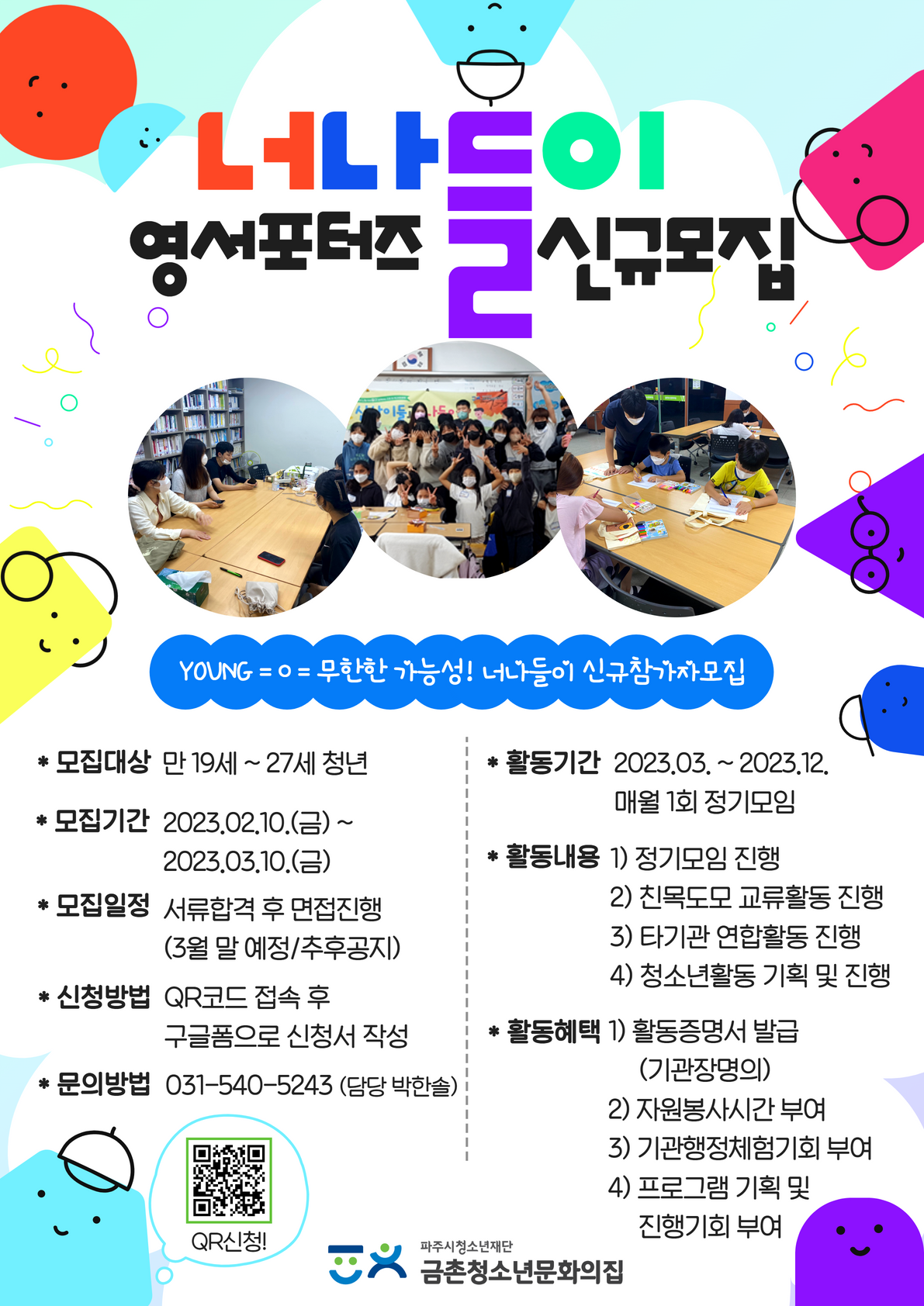 Young = 0 = 무한한 가능성! 그 젊음의 열정과 무한한 가능성을 금촌청소년문화의집에서 활동을 해보세요! 금촌청소년문화의집에서 다양한 청소년활동을 기획 및 진행해보세요. 활동 기획 및 진행은 물론, 증명서 발급, 타기관교류활동과 같은 다양한 활동을 진행할 예정이니! 지원 해주세요!