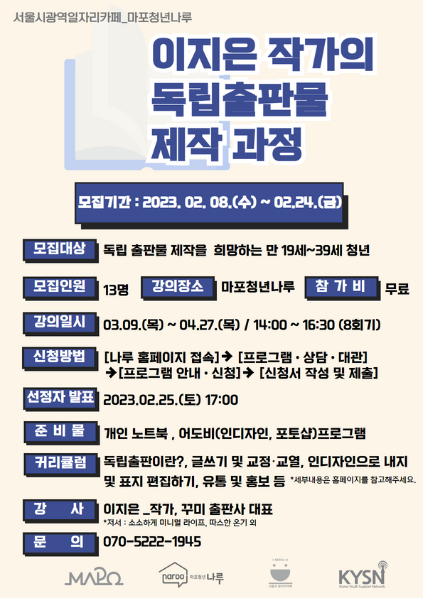 [이지은 작가의 독립 출판물 제작 과정] 참가자 모집 나만의 책을 만들 수 있는 독립출판물 제작 과정이 개설되었습니다! 작년에 참가자분들의 많은 관심으로 상반기, 하반기에 진행되었던 독립출판이 올해에도 상반기 하반기로 나뉘어 진행될 예정인데요! 하반기에는 이북 제작 과정으로 진행되니 올해에도 독립출판물 제작 과정에 많은 관심 바랍니다. : ) 독립출판에 관심이 많았지만, 혼자서 시작하기 두려우셨던 분께서는 이번 기회를 통해 여러분만의 책을 제작해 보세요:) *프로그램 수료자에 한하여 샘플북 제작을 지원해드립니다. #독립출판 #1인출판사 #글쓰기 #샘플북제작 #내지디자인 #표지디자인 #인디자인 #포토샵