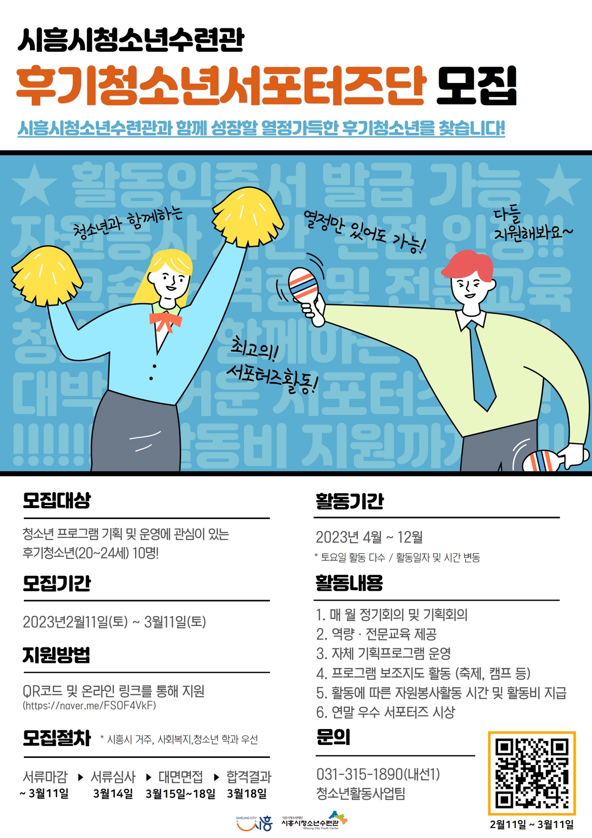[2023년 시흥시청소년수련관 후기청소년서포터즈단 모집!] 시흥시청소년수련관에서는 청소년활동과 대외활동에 관심이 있는 후기청소년(20\~24세)을 모집하고 있습니다.