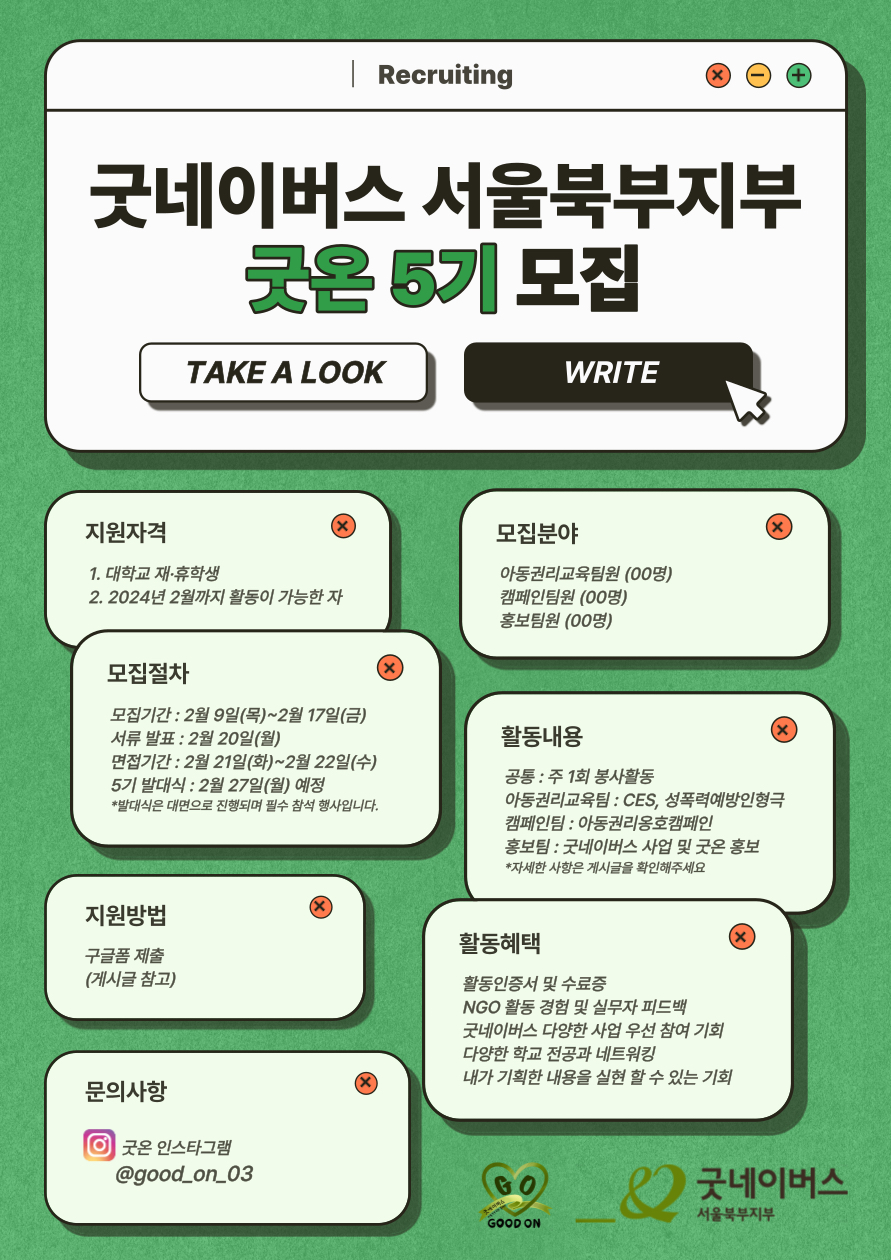 🍀굿네이버스 서울북부지부 대학생자원봉사동아리 '굿온'에서 5기를 모집합니다🍀