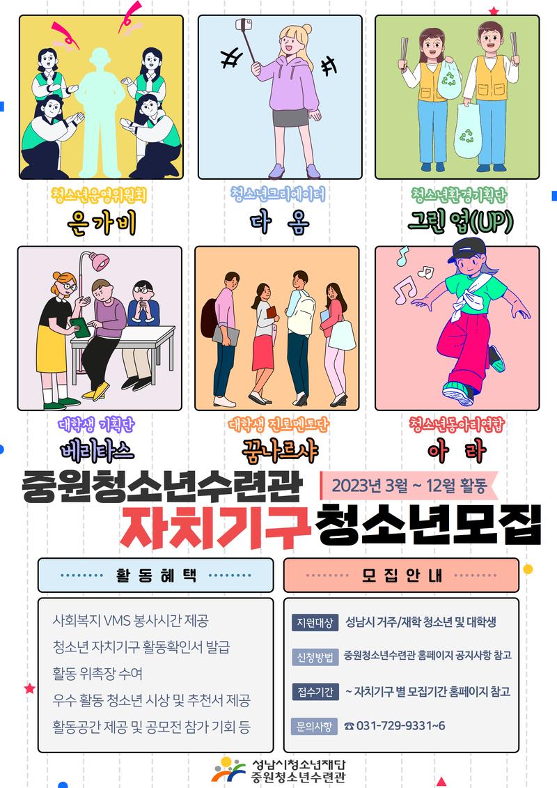 <2023년 중원청소년수련관 자치기구 청소년 모집> 성남시청소년재단 중원청소년수련관 자치기구 청소년을 모집합니다! 관심 있는 자치기구에 가입해보세요! 아래의 해당 링크(신청) 클릭! ★ 청소년운영위원회 은가비 - 청소년 참여기구로서 수련관 운영에 직접 참여하는 수련관 대표 법적 자치기구 ☞ https://naver.me/Ix7aFpw9 ★ 청소년크리에이터 다옴 - 청소년크리에이터 유튜브 개설, 영상촬영, 편집 등 전문교육을 통해 창의적인 영상 크리에이터로 성장 지원 ☞ https://naver.me/xHnjxNRH ★ 청소년환경기획단 그린 업(up) - 기후위기 캠페인, 리사이클 상품 제작 등 친환경 기획활동 ☞ https://naver.me/5wHO1Yzu ★ 청소년동아리연합 아라 - 댄스, 보컬, 힙합, 치어리딩 등 다양한 동아리로 구성된 동아리 연합 아라 ☞ https://naver.me/xgTzBV3b ★ 대학생기획단 베리타스 - 후기 청소년 및 대학생으로 구성된 자치기구로 창의적인 아이디어 컨텐츠 기획활동 운영 ☞ https://url.kr/u26qob ★ 대학생진로멘토단 꿈나르샤 - 다양한 진로영역에서 청소년의 눈높이에 맞는 진로탐색, 진로프로그램 제공을 통해 성장을 지원하는 꿈나르샤! ☞ https://naver.me/GItT3O4H