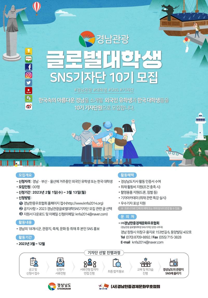 한국 속의 아름다운 경남을 소개할 외국인 유학생과 한국 대학생들을 10기 기자단원으로 모집합니다. ●모집개요 - 신청자격: 경남·부산·울산에 거주 중인 외국인 유학생 또는 한국 대학생(부울경 이외 지역 모집X) - 모집인원: 00명 - 신청기간: 2023년 2월 1일(수) \~ 3월 13일(월) - 신청방법 1. 경남한중우호협회 홈페이지 접속(http://www.knfa2014.org/) 2. 공지사항 > 2023 경남관광글로벌대학생SNS기자단 모집 관련 글 선택 3. 지원서 다운로드 및 이메일 신청 접수 ☞ knfa2014@naver.com ●활동내용 - 경남의 18개 시군, 관광지, 축제, 문화 등 취재 후 본인 SNS 홍보 ●활동기간 - 2023년 3월\~12월 ●활동혜택 - 경상남도지사 활동 인증서 수여 - 취재활동비 지원(조건 충족 시) - 촬영용품 지원(드론, 짐벌) - 기자아카데미(취재 관련 특강 실시) - 우수기자 포상지원 - 월별 투어킹 시상(*시상 별도) *코로나19로인해 위 혜택 또는 취재 방식이 변경 될 수 있음. ●문의처 09:00\~18:00 - (사)경남한중경제문화우호협회 (경남관광글로벌대학생SNS기자단운영 사무국) - 주소: 경남 창원시 의창구 용지로 153번길 6, 동양빌딩 402호 - TEL. 070-8709-8892 / FAX. (055)715-3828 - E-mail. knfa2014@naver.com