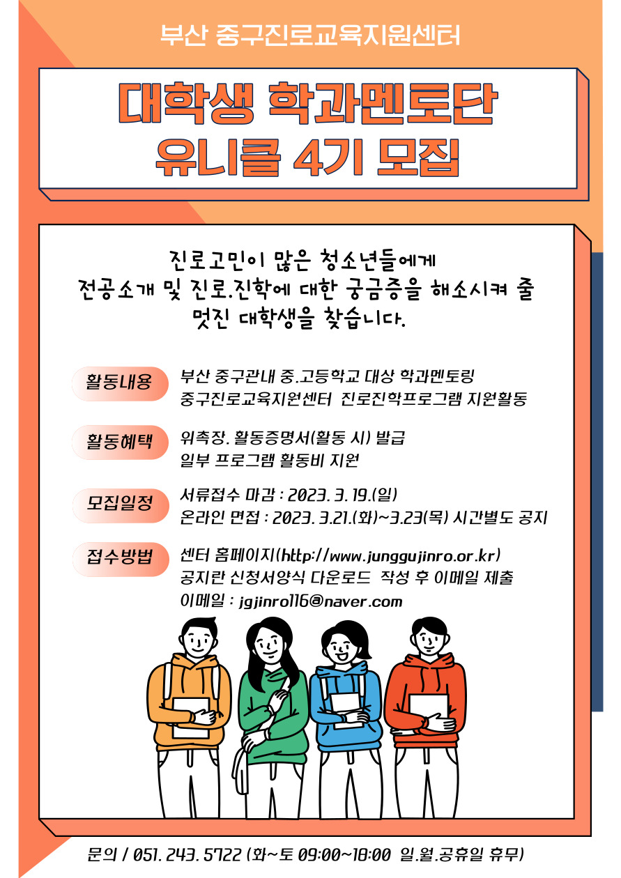 부산중구진로교육지원센터 대학생학과멘토단 모집(\~3/19) *활동내용 부산 중구관내 중.고등학교 학생 대상 학과멘토링 중구진로교육지원센터 진로진학프로그램 지원활동 *활동혜택 위촉장. 활동증명서(활동 시) 발급 일부 프로그램 활동비 지원