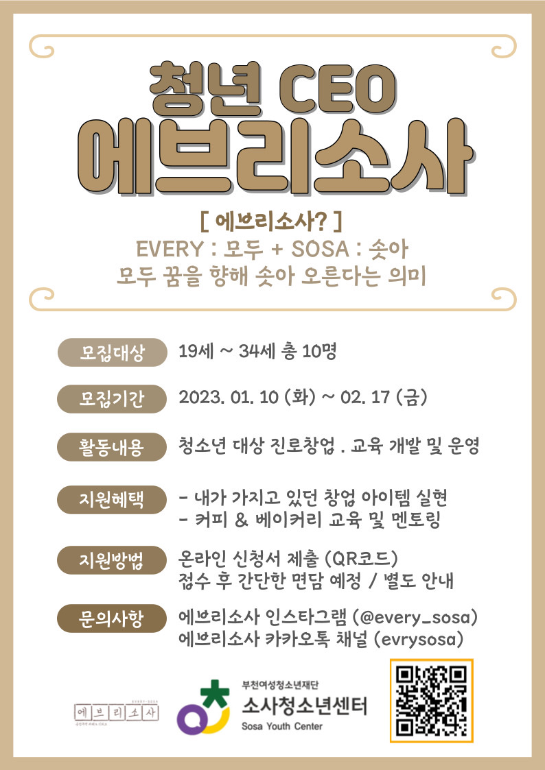 안녕하세요! 소사청소년센터 소속 청년CEO '에브리소사'입니다. 23년도 청년CEO '에브리소사'에서 함께 꿈을 이뤄갈 청년을 모집합니다!