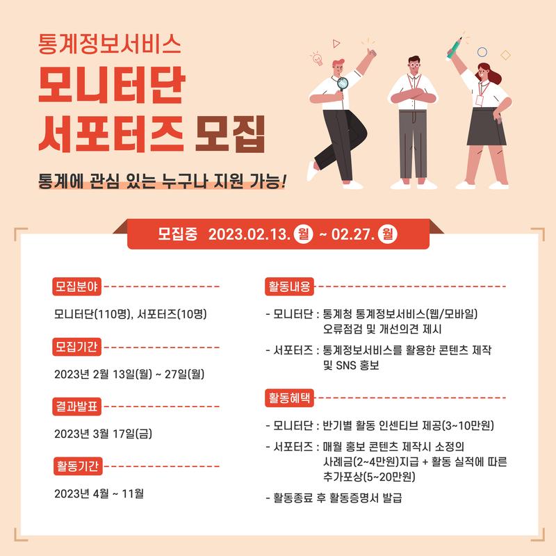 ○ 서포터즈 : 10명 □ 모집 일정 ○ 지원서 접수 : 2023. 2. 13.(월) \~ 2. 27.(월) ○ 결과 발표 : 2023. 3. 17.(금) - 각 통계정보서비스 홈페이지에 공지/합격자 개인에게 문자 등 알림 □ 활동 계획 ○ 활동 기간 : 2023년 4월 \~ 11월(8개월) ○ 활동 내용 - 모니터단 : 각 서비스 오류점검 및 개선의견 제출(격월, 총 4회) - 서포터즈 : 통계정보서비스를 활용한 콘텐츠 제작 및 SNS 게시(매월 1건 이상) □ 활동 혜택 ○ 공통 : 활동증명서 발급 및 활동기념품 증정 ○ 모니터단 : 활동실적에 따라 반기별 인센티브 지급 - 최우수 10만원, 우수 5만원, 장려 3만원 ○ 서포터즈 : 매월 활동사례금 지급, 반기별 우수콘텐츠 포상 - 활동사례금 2\~4만원(회차당), 우수콘텐츠 포상(5\~20만원) ※ 인센티브, 활동사례금, 우수콘텐츠 포상은 모바일 상품권으로 지급됨 지원 링크 주소 : https://www.index.go.kr/unity/potal/recruitIntro.do