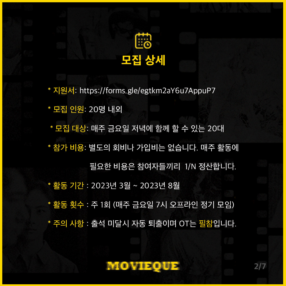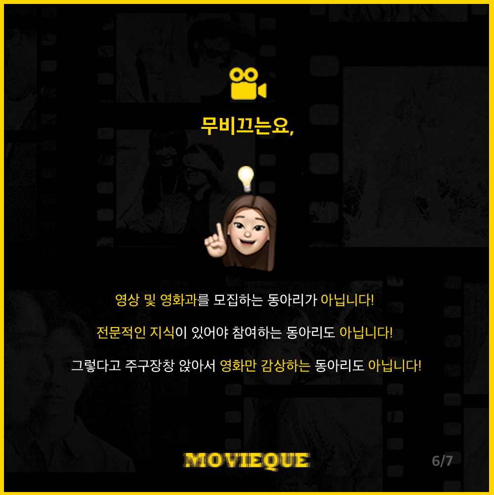⭐️ 영상 및 영화과를 모집하는 동아리가 아닙니다! 전문적인 지식이 있어야 참여하는 동아리도 아닙니다! 그렇다고 주구장창 앉아서 영화만 감상하는 동아리도 아닙니다! 영화와 관련 있는 다양한 기획과 감상, 그리고 덕질(!)까지, 마음껏 취향을 공유하며 즐길 수 있는 동아리입니다.