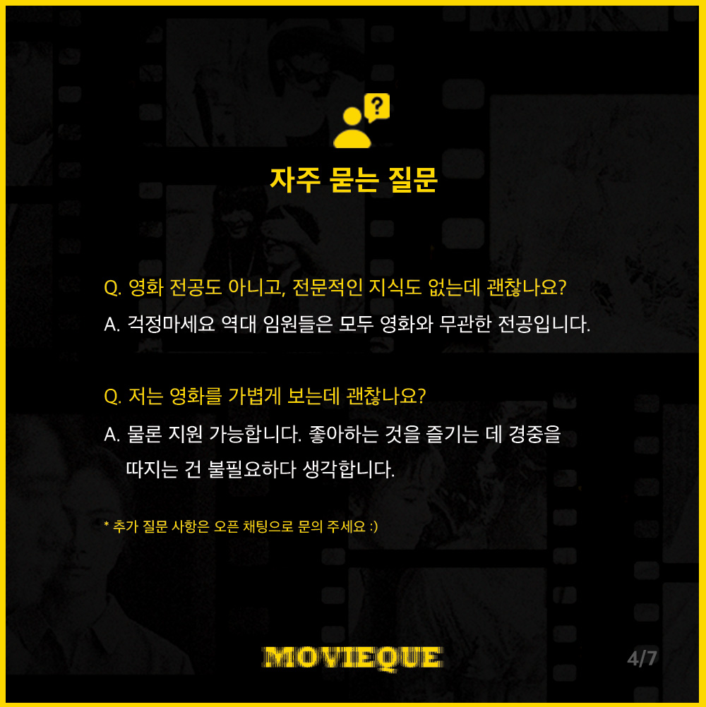 4. 저는 영화를 가볍게 보는데 괜찮나요? // 물론 지원 가능합니다. 좋아하는 것을 즐기는 데 경중을 따지는 건 불필요하다 생각합니다.
