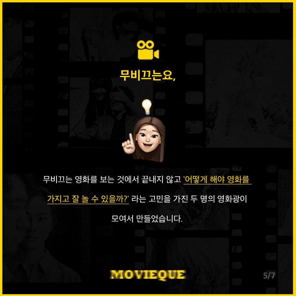 ⭐️ 무비끄는 영화를 보는 것에서 끝내지 않고 '어떻게 해야 영화를 가지고 잘 놀 수 있을까?' 라는 고민을 가진 두 명의 영화광이 모여서 만들었습니다.