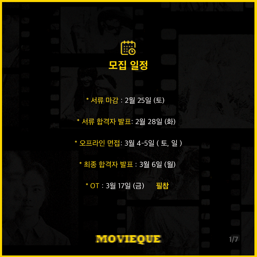 🎉 취향껏 영화로 놀자! 🎉 영화 + 기획 동아리 ‘무비끄’에서 6기 회원을 모집합니다! ‘Movie + Boutique = Movieque’ 무비끄는 ‘영화 잡화점’ 이라는 뜻을 가지고 있습니다.