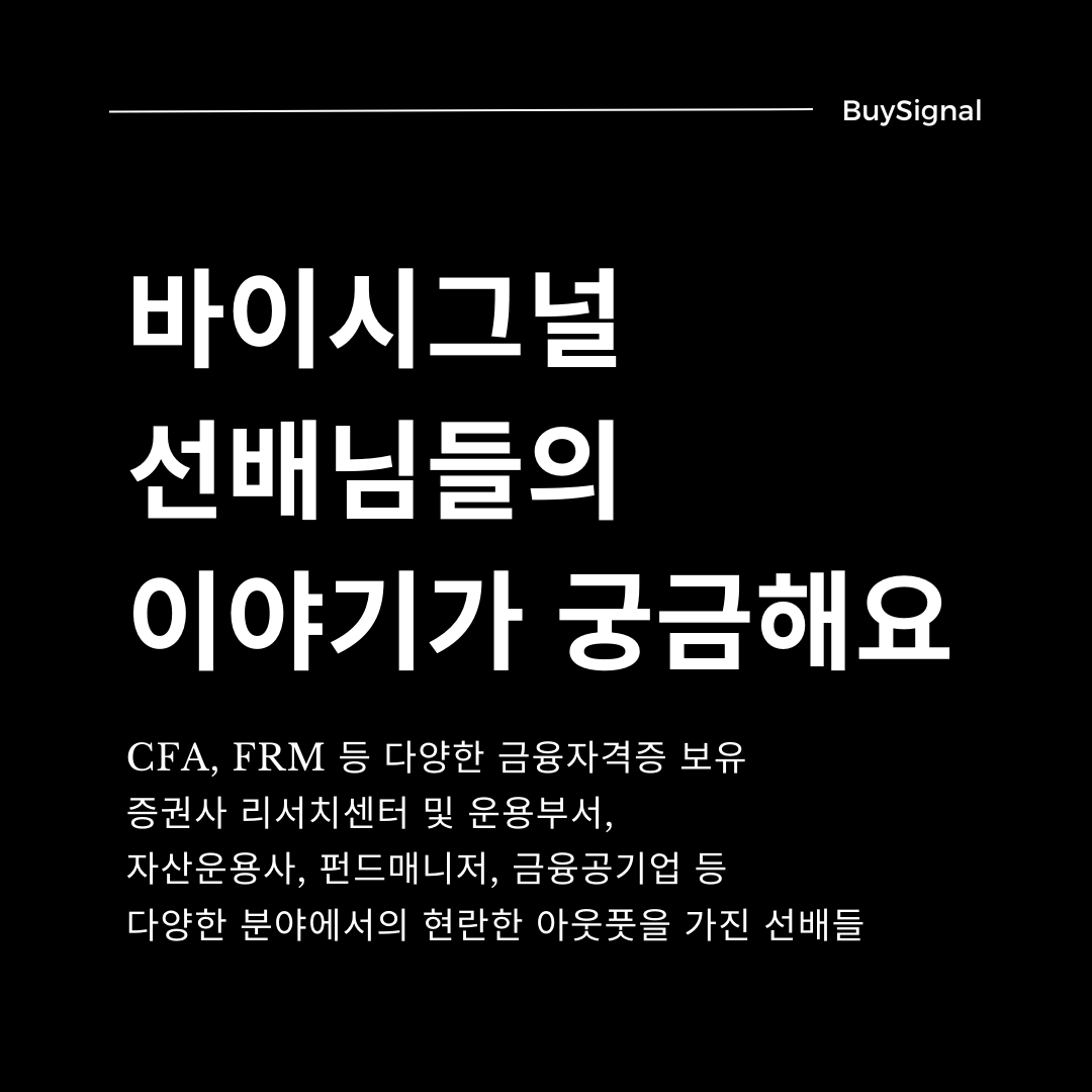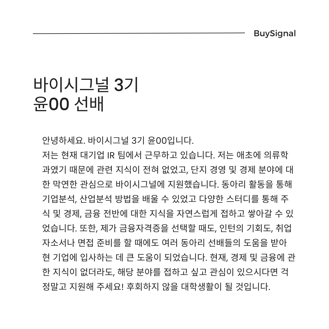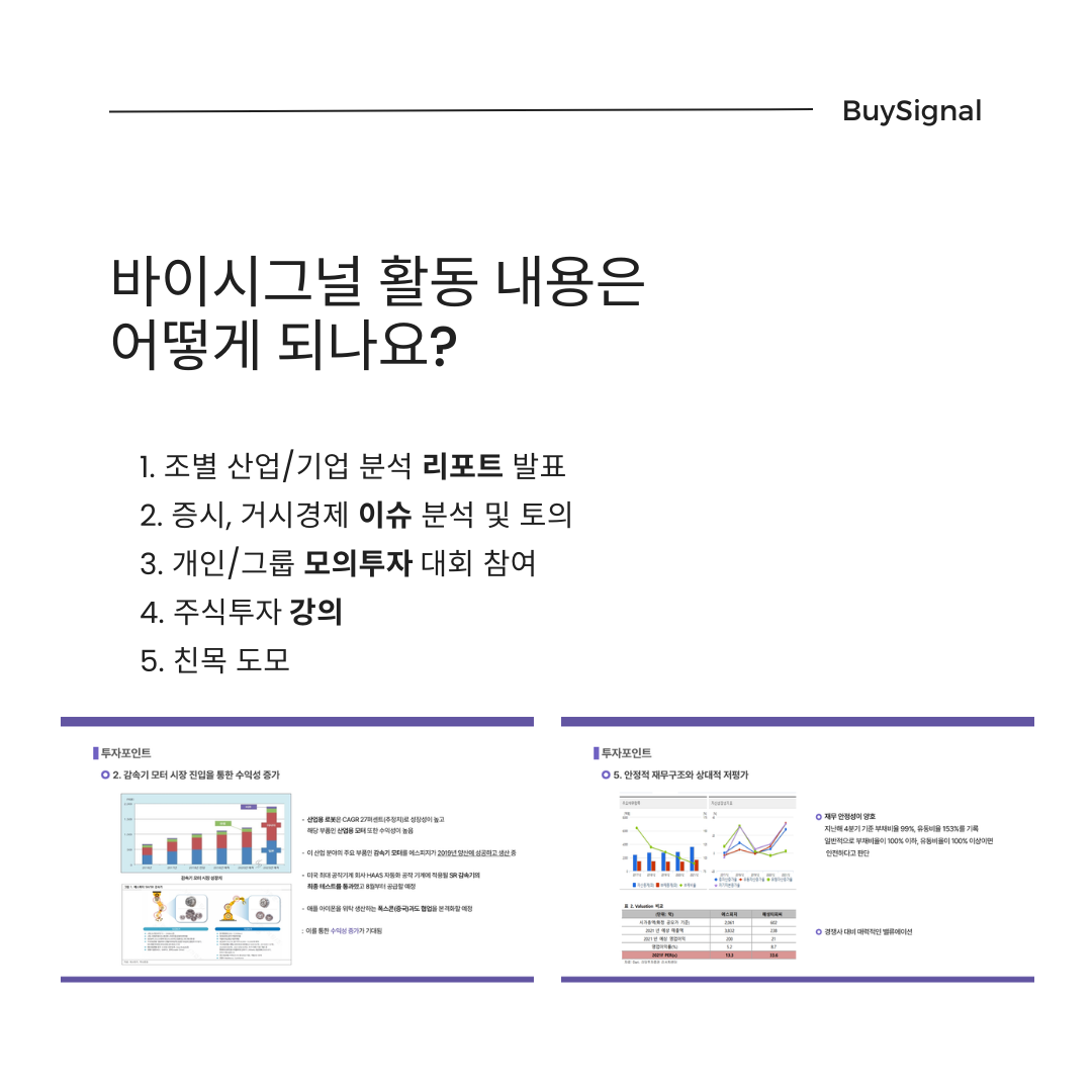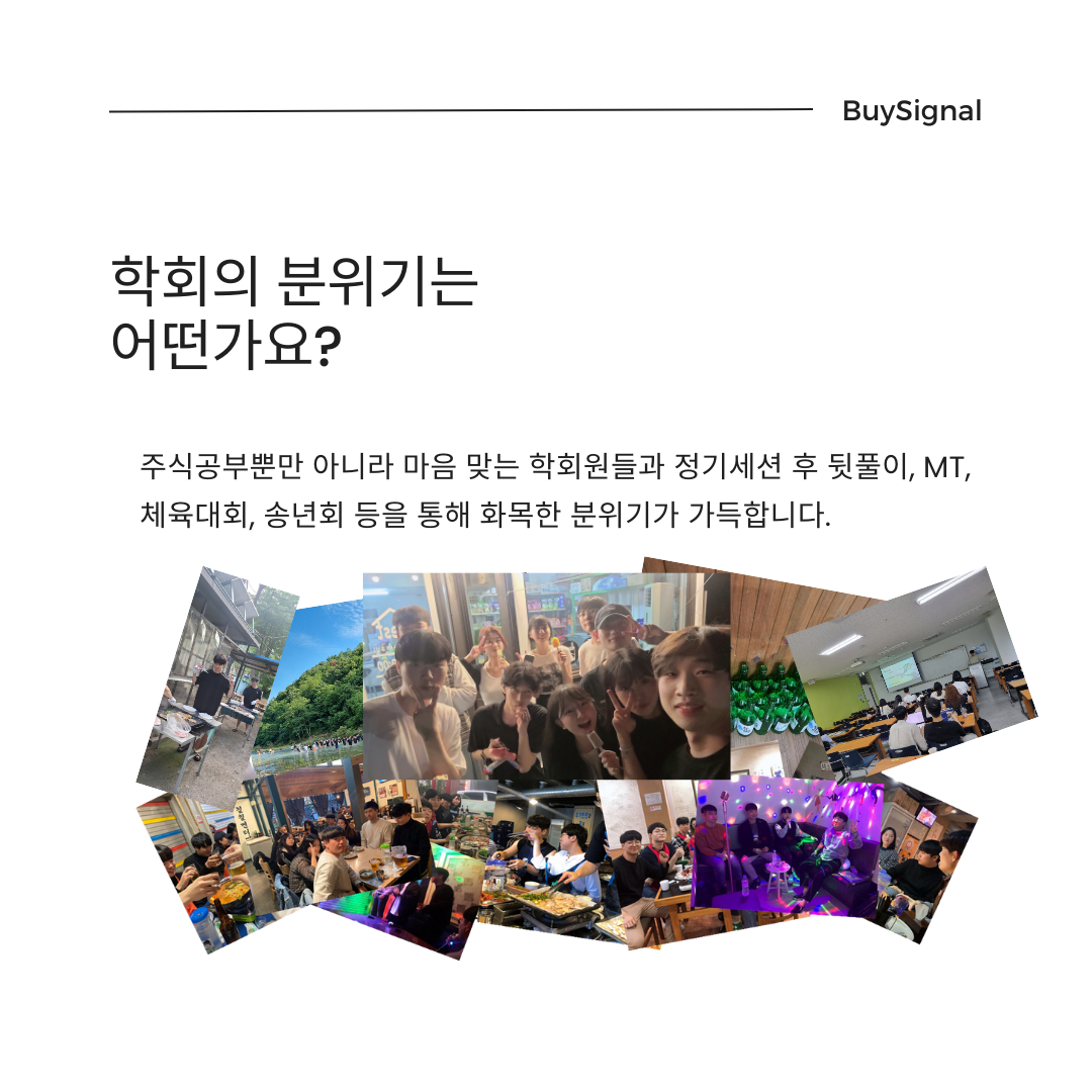 Buysignal은 여러 대학생들이 모여서 투자에 대한 Idea를 공유하는 대학생 연합 투자학회입니다.