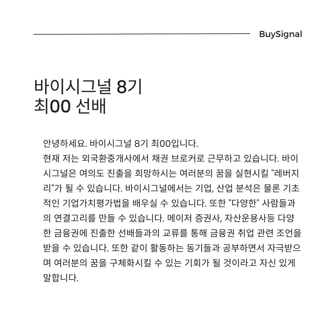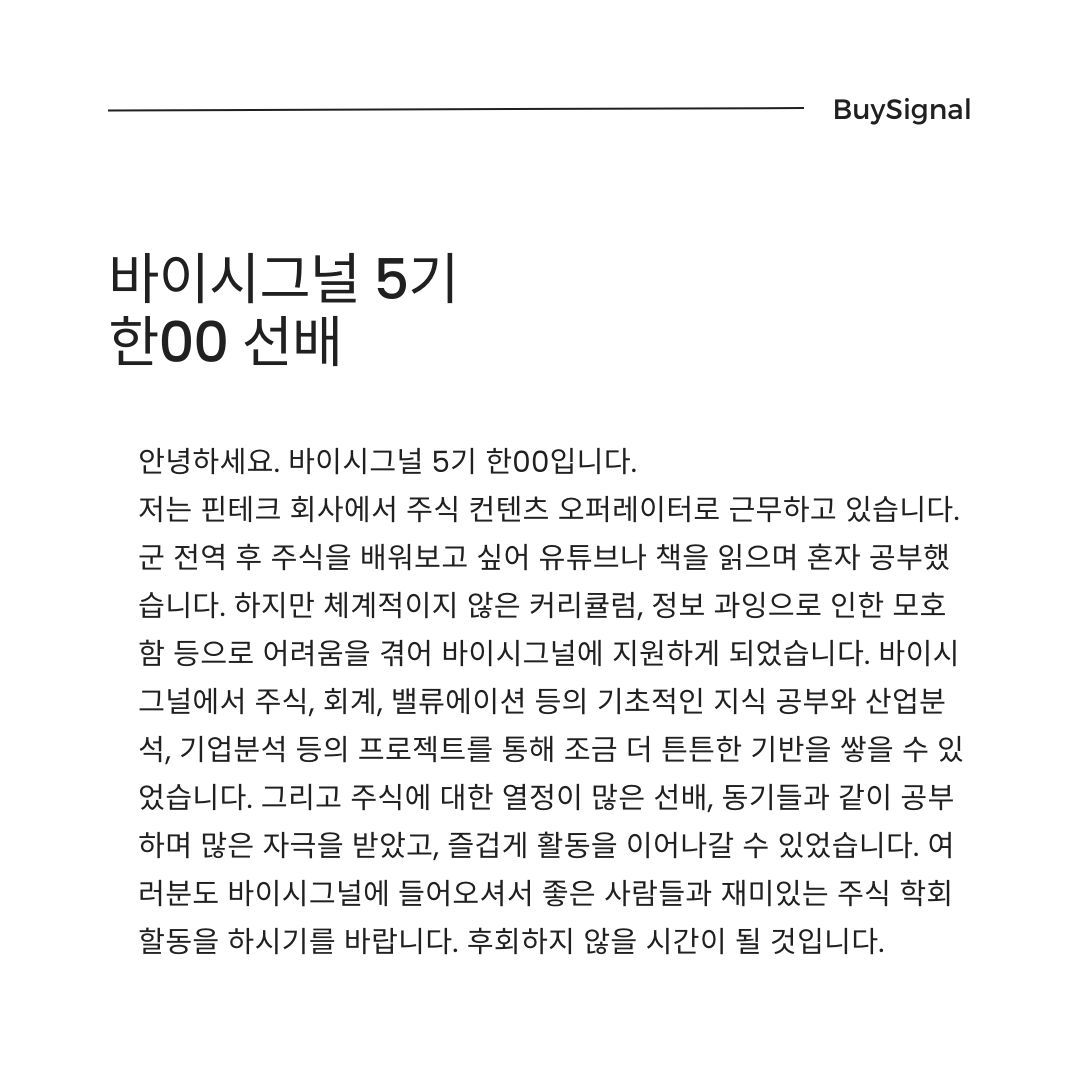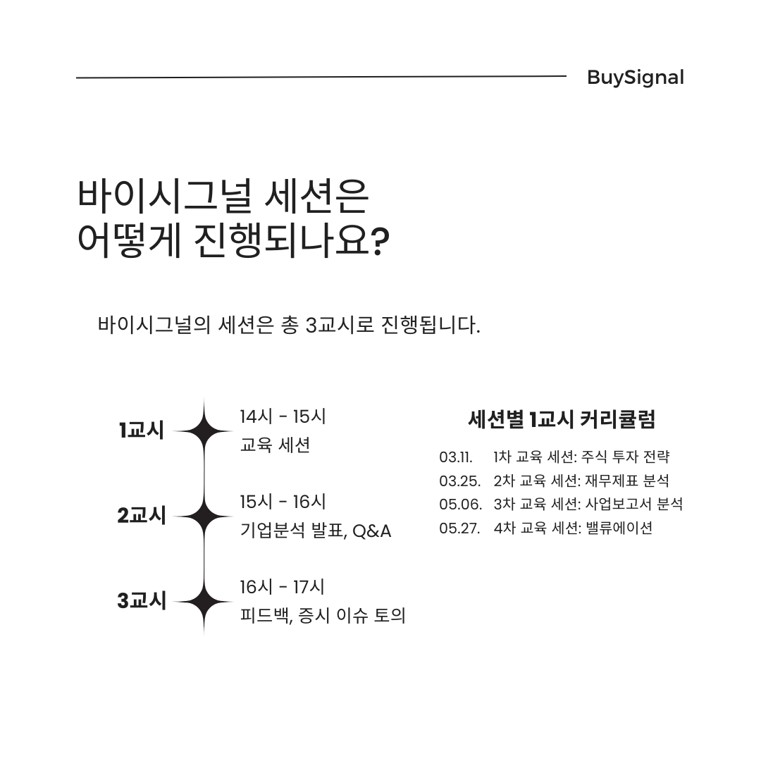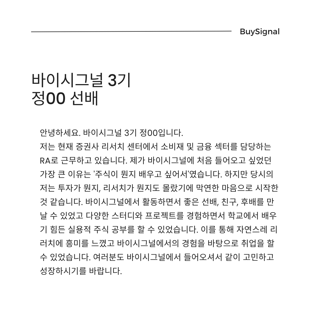 Buysignal은 여러 대학생들이 모여서 투자에 대한 Idea를 공유하는 대학생 연합 투자학회입니다.