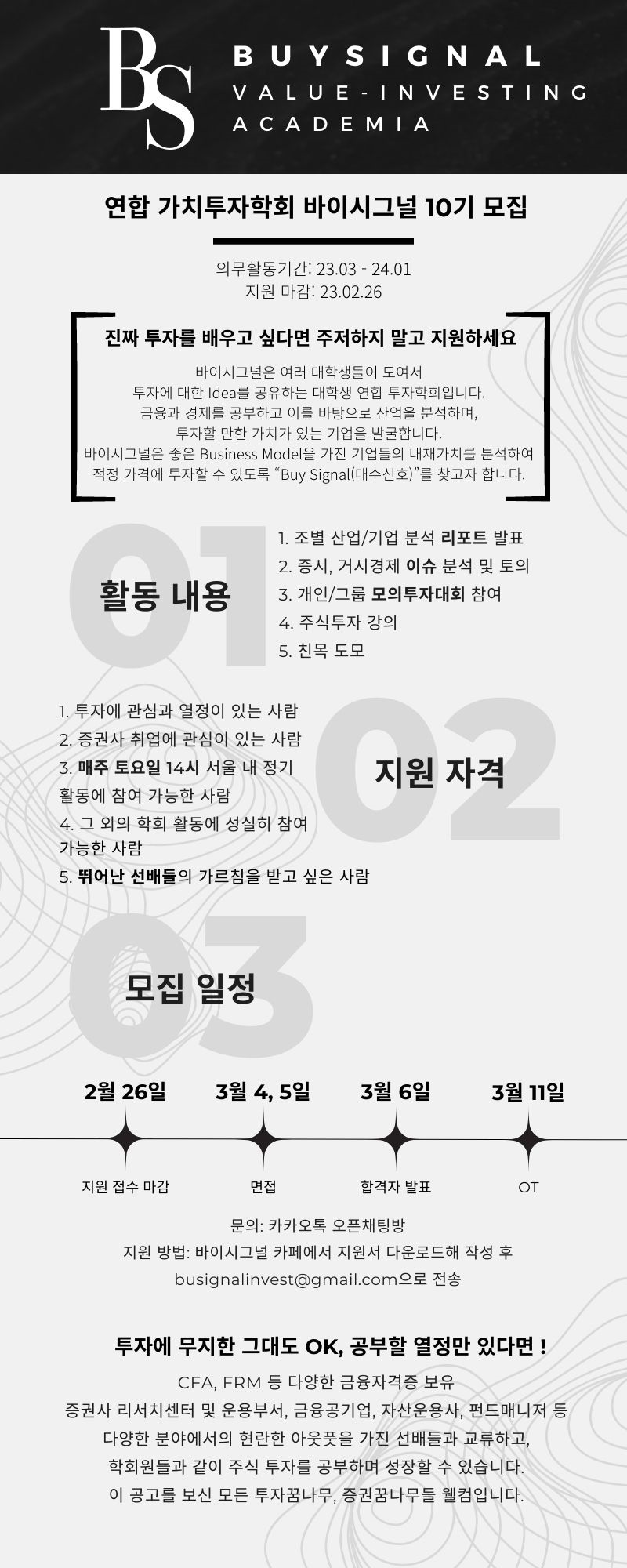 📈<\~2/26일> 대학연합 가치투자 학회 'Buysignal'에서 10기 학회원을 모집합니다!📈