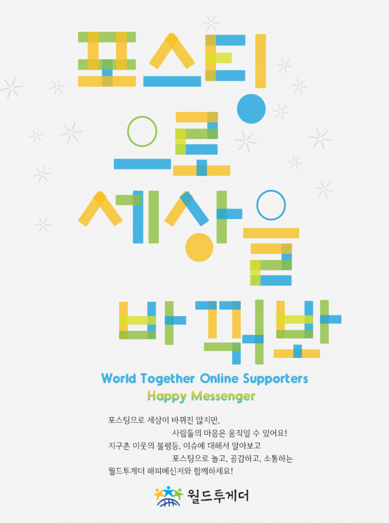 ⭐️국제개발협력 NGO 월드투게더에서 지구촌 이웃 자립의 가치를 온라인에 알리고, 세상에 작은 변화들을 함께 만들어갈 온라인 서포터즈 해피메신저를 300명을 모집합니다!