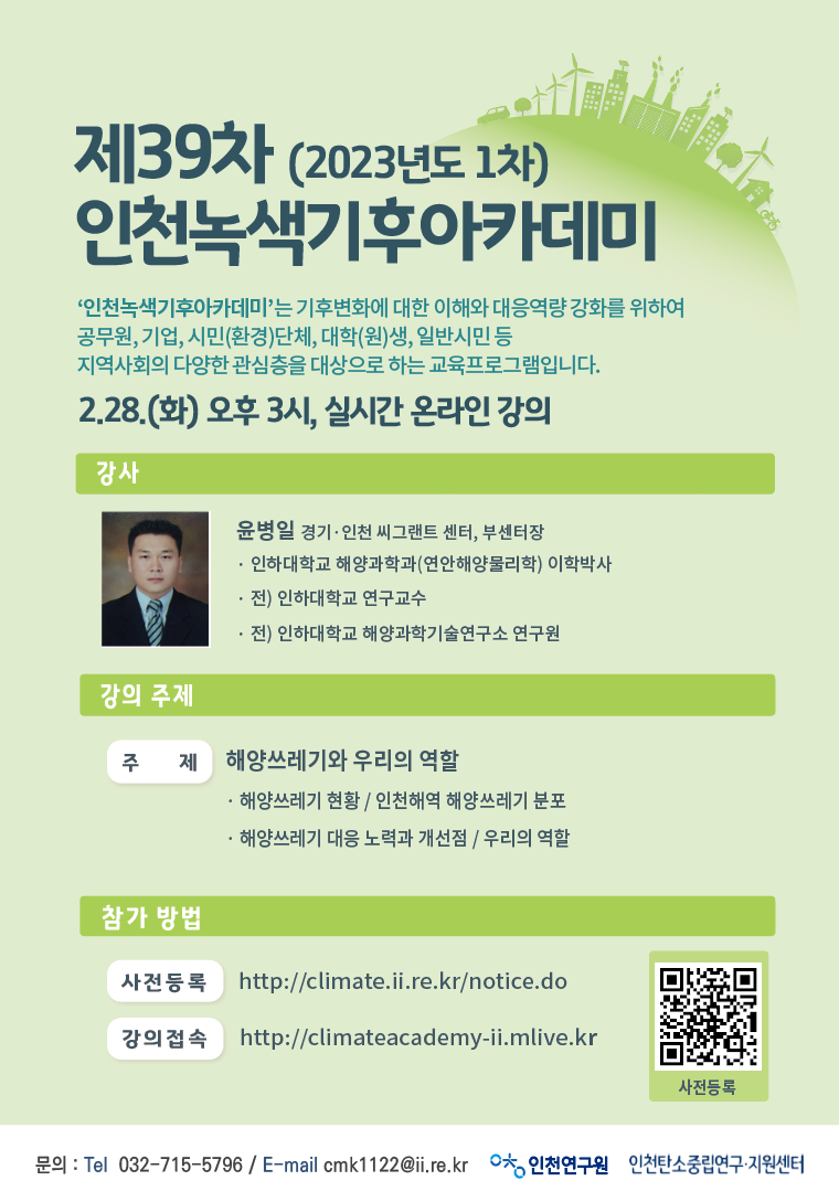 안녕하세요. (재)인천연구원 인천탄소중립연구지원센터입니다. 인천탄소중립연구지원센터에서는 시민, 시민단체, 기업체 및 유관기관, 공무원, 국제기구 및 유관기관의 기후변화에 대한 이해와 대응역량 강화를 위한 교육프로그램인 인천녹색기후아카데미를 정기적으로 주최하고 있습니다. 39번째를 맞는 이번 인천녹색기후아카데미는 ‘해양쓰레기와 우리의 역할’이라는 주제로 2월 28일(화) 오후 3시에 별도의 웹사이트에서 실시간 온라인 강의로 개최됩니다. 여러분의 많은 관심과 참여 부탁드립니다. 감사합니다.