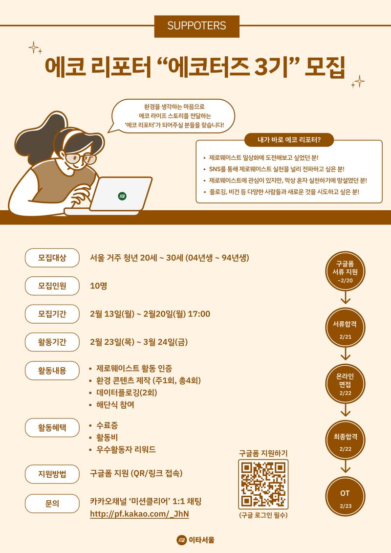 2023년 새해를 맞이하여 저희와 함께 활동하실 서포터즈를 모집합니다. 제로웨이스트를 실천하고 환경을 생각하는 마음을 가지고 계시는 분들! 여러분의 이야기를 많은 사람들에게 전달하는 ‘에코 리포터’가 되어주실 분들을 찾습니다! 기후위기 시대를 맞아 두려운 마음을 해소하고 다른 청년분들과 함께 지구와 환경을 위해 그리고, 나를 위해 활동하고 싶은 모든 분들 환영합니다 :)