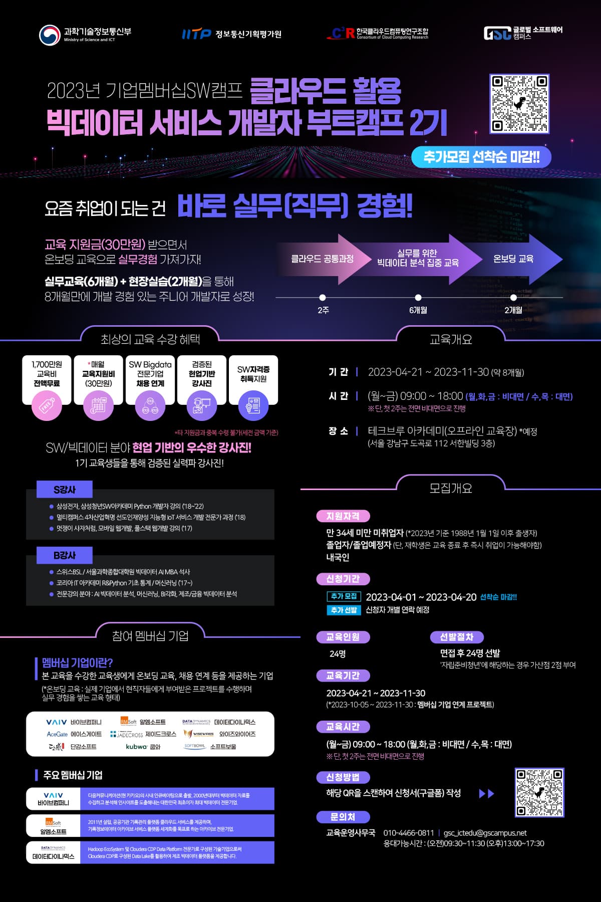 [2023 기업멤버십 SW캠프] 클라우드 활용 빅데이터 서비스 개발자 부트캠프 2기 ※ 본 교육과정 수강신청은 아래 '교육 신청하기 URL'에 접속하여 지원서 작성 및 신청 바랍니다. ※ 본 과정의 교육기간은 2023년 4월 21일 \~ 2023년 11월 30일입니다. ※ 본 교육과정은 글로벌소프트웨어캠퍼스에서 직접 운영하는 과정입니다. (과정별 교육기관 및 운영장소가 상이하니 반드시 확인 바랍니다.)