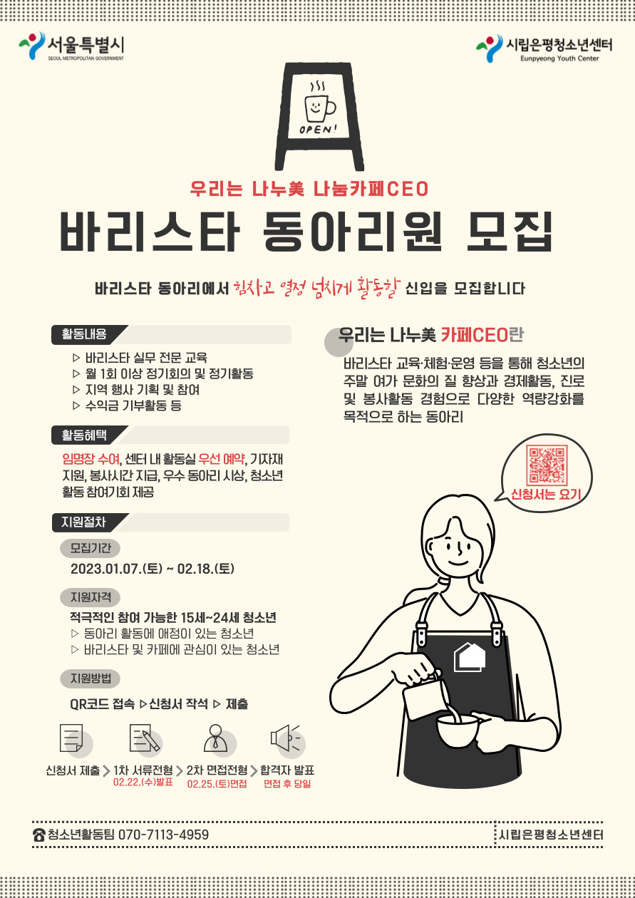 ✔ 지원 절차 - 모집기간 : 2023.01.07.(토)\~02.18.(토)까지 - 지원자격 : 적극적으로 참여 가능한 15세\~24세 청소년이면 누구나 가능 * 동아리 활동에 애정이 있는 청소년(우대) * 바리스타 및 카페에 관심이 있는 청소년(우대) - 1차 서류전형 : 02.22.(수) 발표 (개별연락) - 2차 면접전형 : 02.25.(토) 면접 (당일 합격자 발표)