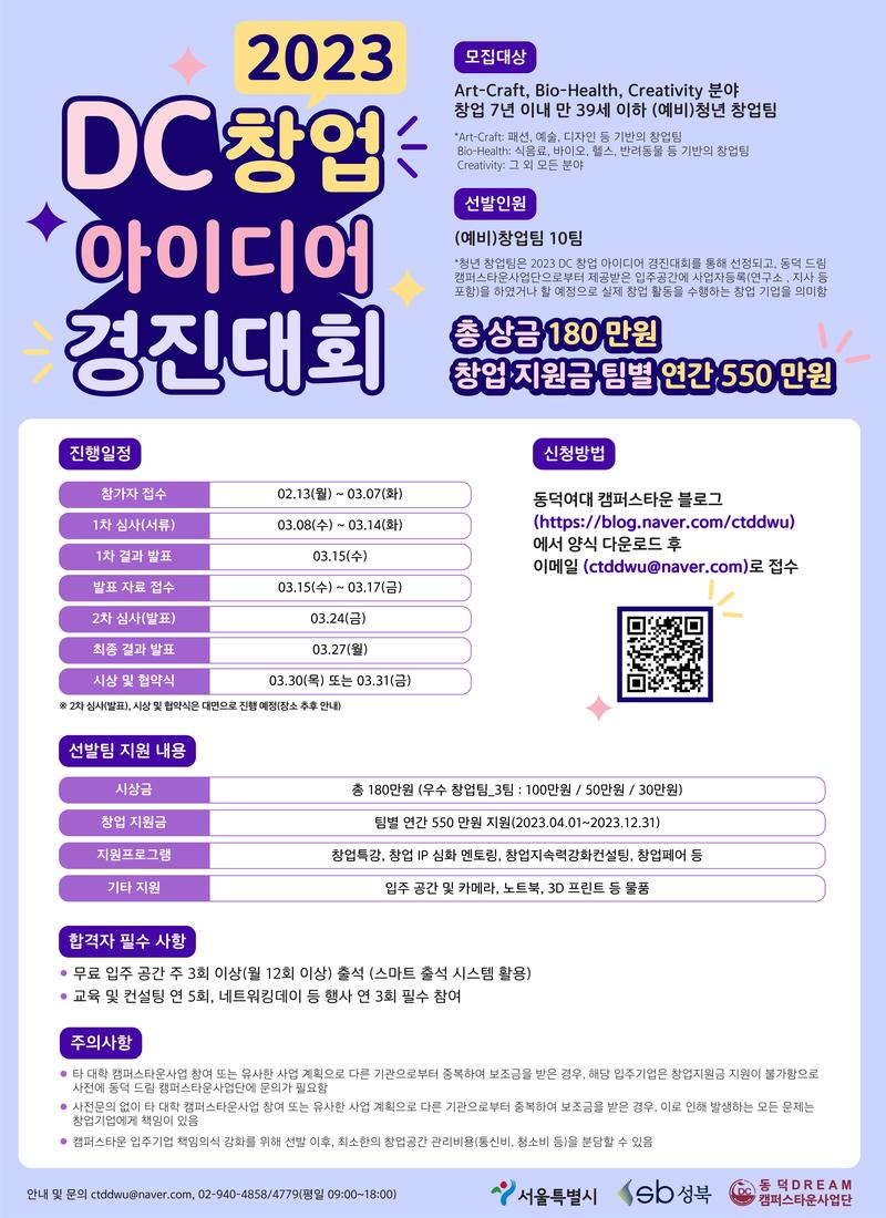 동덕여자대학교 드림 캠퍼스 타운 사업단에서 ‘2023 DC(Dream Campustown) 창업 아이디어 경진대회’를 개최합니다.