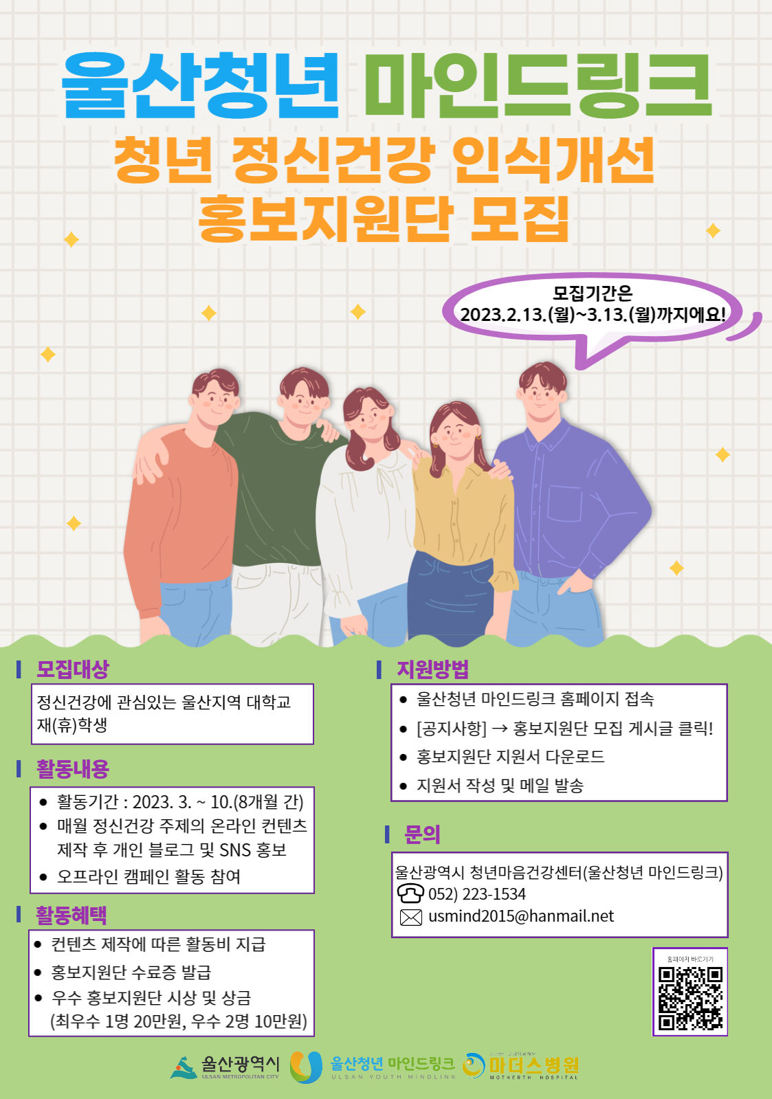 울산광역시 청년마음건강센터 울산청년 마인드링크에서는 청년층의 정신건강 인식개선을 위해 함께 활동할 홍보지원단을 모집합니다. 많은 관심과 참여 부탁드립니다. ■ 모집대상 - 정신건강에 관심있는 울산지역 대학생 - 개인 SNS 및 블로그에 정신건강 관련 컨텐츠를 게시 가능한 자