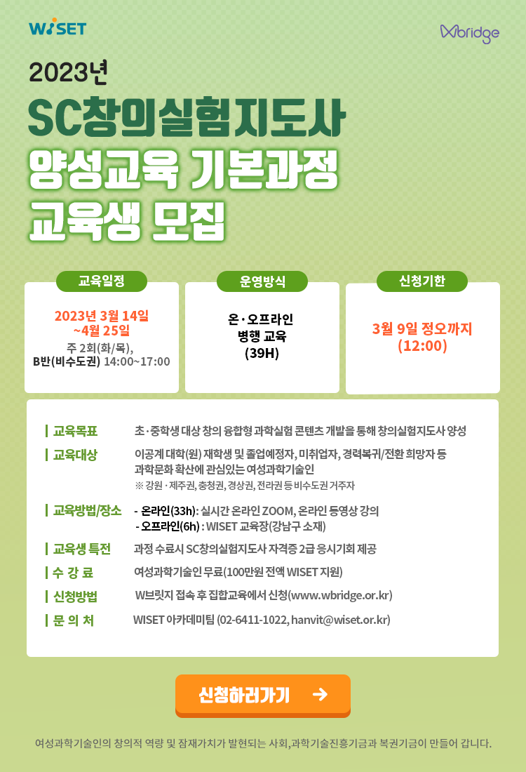 [2023년 SC 창의실험지도사 양성교육 기본과정 교육생 모집] (1) 목적: 초·중학생 대상 창의융합형 과학실험콘텐츠 개발을 통해 창의실험지도사, 방과후 교사로 양성될 수 있도록 지원 (2) 대상: 이공계 전공 대학(원) 재학생 및 졸업예정자, 미취업자, 경력복귀/전환 희망자 등 과학문화 확산에 관심 있는 여성과학기술인 50명 (3) 일시: 2023.03.14.\~ 2023.04.25. 매주 화/목, A반(수도권거주자대상) 10:00\~13:00/B반(비수도권 거주자대상/ZOOM강의) 14:00\~17:00 ※ 동일내용으로 2개 분반으로 운영됨 (4) 내용: W브릿지 공지사항 참조 (https://bit.ly/3E4VrOG) (5) 교육비: 무료 (6) 신청 마감: \~3/12(일) 23:59까지 (7) 신청 바로가기: A반 https://bit.ly/3Ih3QBi / B반 https://bit.ly/40O9OAT
