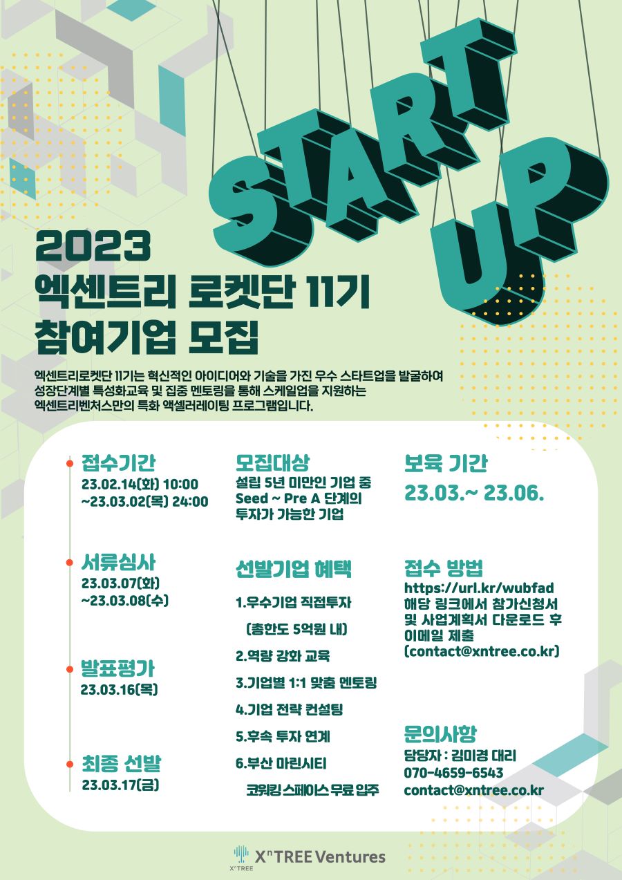 XntreeVentures와 함께하는 엑센트리로켓단 11기에 참여할 혁신적인 아이디어를 가진 스타트업을 찾습니다!