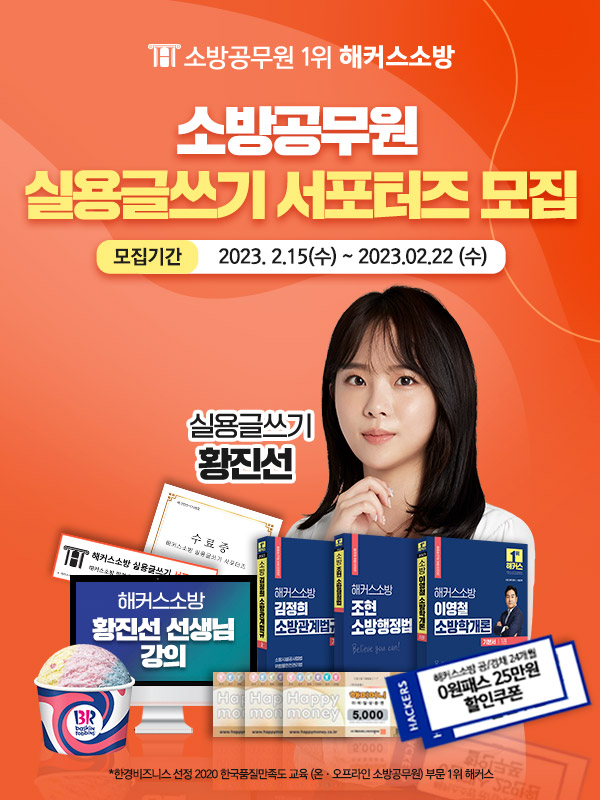 📌 모집 일정 2023.2.15 (수) \~ 2023.2. 22 (수) 4pm 📌 합격자발표 2023.2.23 (목) * 지원서에 기재해주신 메일/휴대폰 번호로 개별 통지 예정입니다. 📌 활동기간 2023.2.27 (월) \~ 2023.3.17 (금) * 약 3주간 활동 📌 활동 내용 ① 해커스소방 실용글쓰기 인강 수강 후 개인 블로그에 주 1회 후기성 포스팅 작성 (총 3회) ② 해커스소방 황진선 선생님 수강후기 작성 (총 2건) * 자세한 활동 가이드라인은 합격자에 한해 발송 예정입니다. 📌 지원방법 ① 위 이미지 또는 구글폼 링크를 클릭하여 지원서 문항을 빠짐없이 작성하면 지원 끝! ② 본 게시글을 SNS에 공유 후 URL을 지원서에 기재해 주시면 합격률이 2배로 높아집니다. 💛