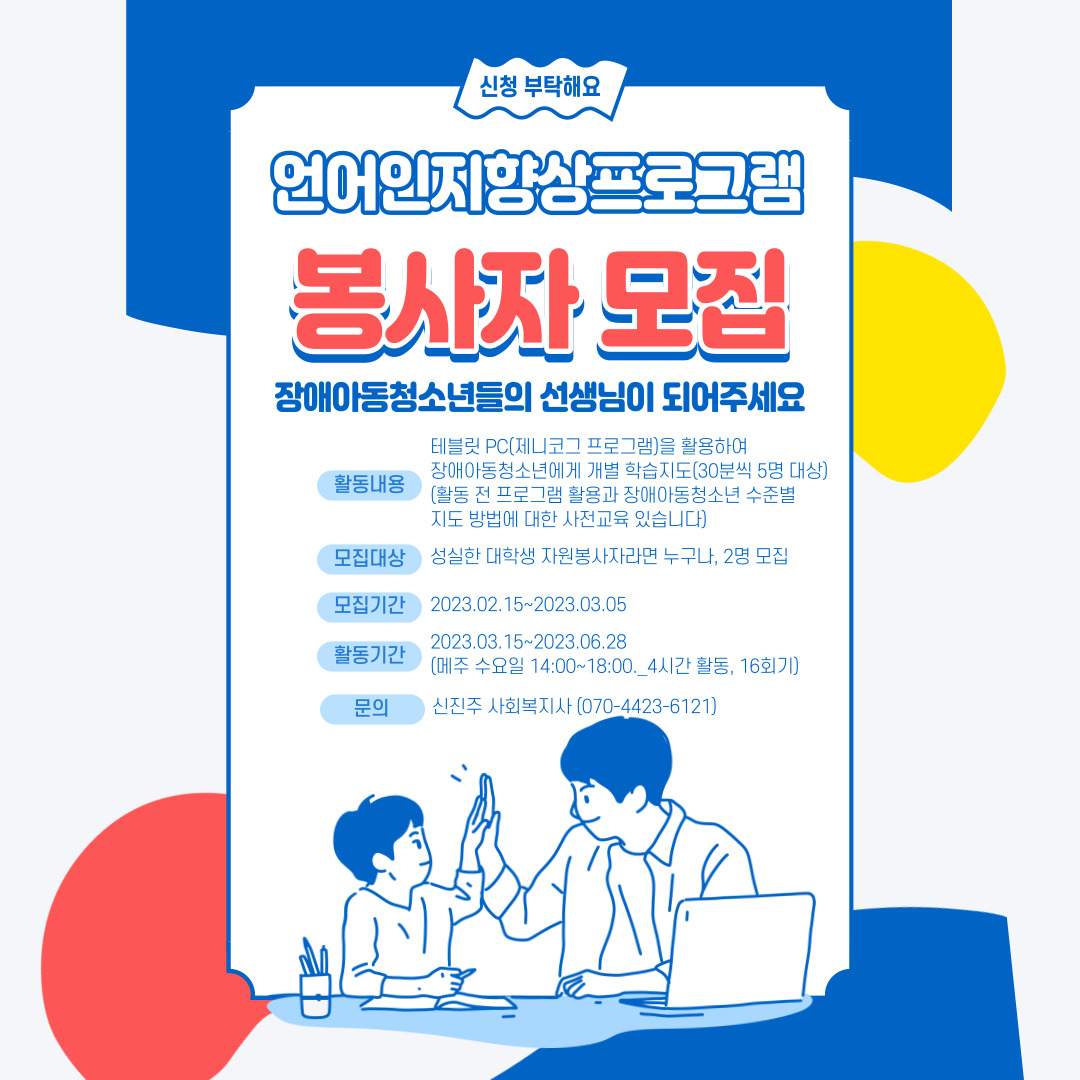장애 아동청소년 친구들에게 언어인지 학습지도를 해주실 자원봉사자를 모집합니다.